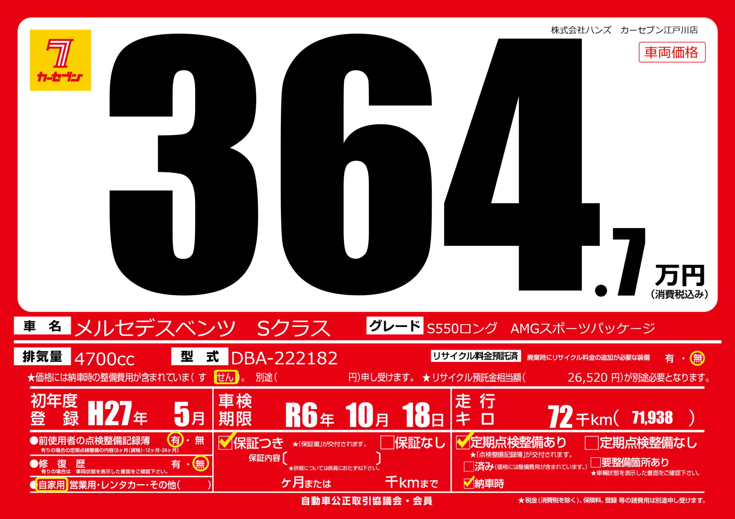 | 車名 | メルセデスベンツ Sクラス | グレード ミッション 排気量 |