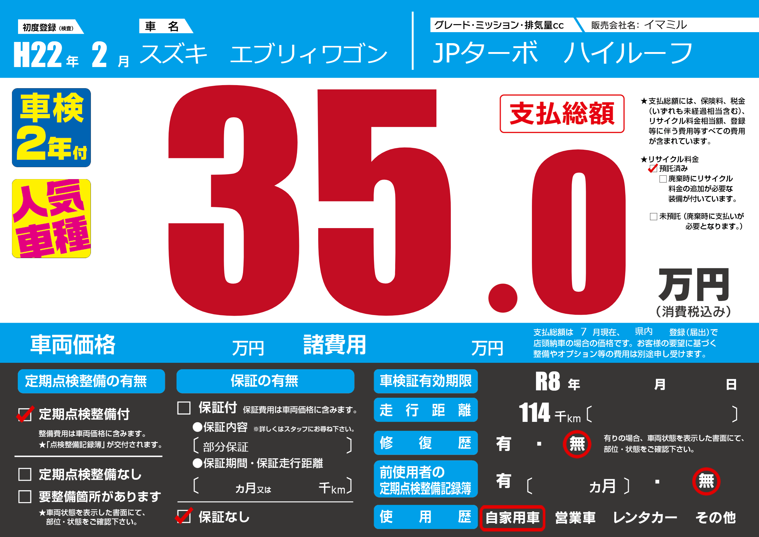 | 車名 | スズキ エブリィワゴン | グレード ミッション 排気量 |