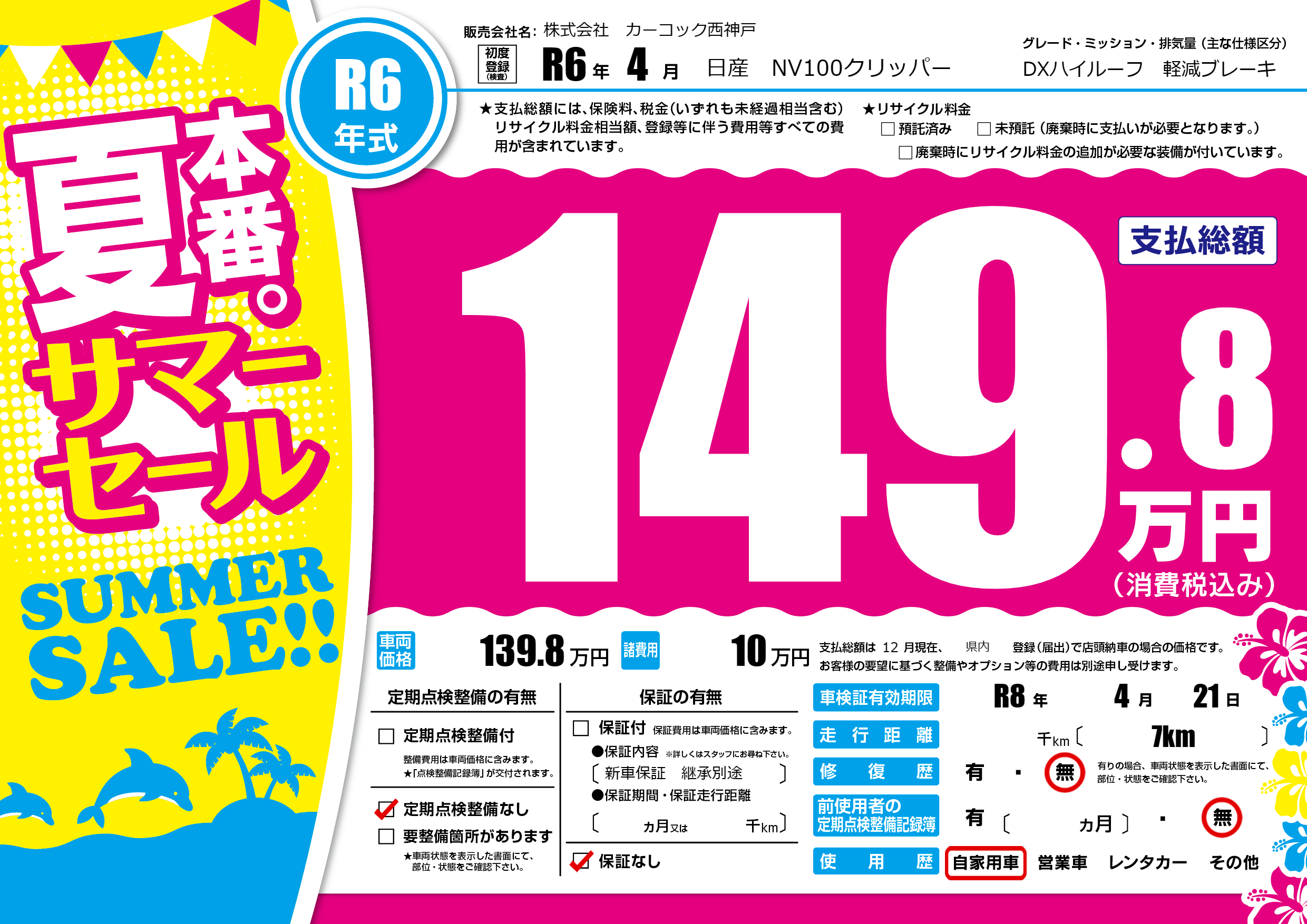 保証なし 保証内容(新車保証 継承別途) ---ヶ月または()千kmまで |