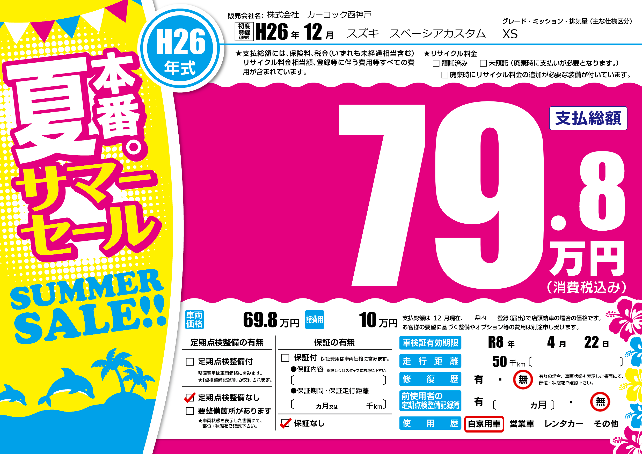 | 走行キロ | 5万km | 初年度登録 | H26年12月 |