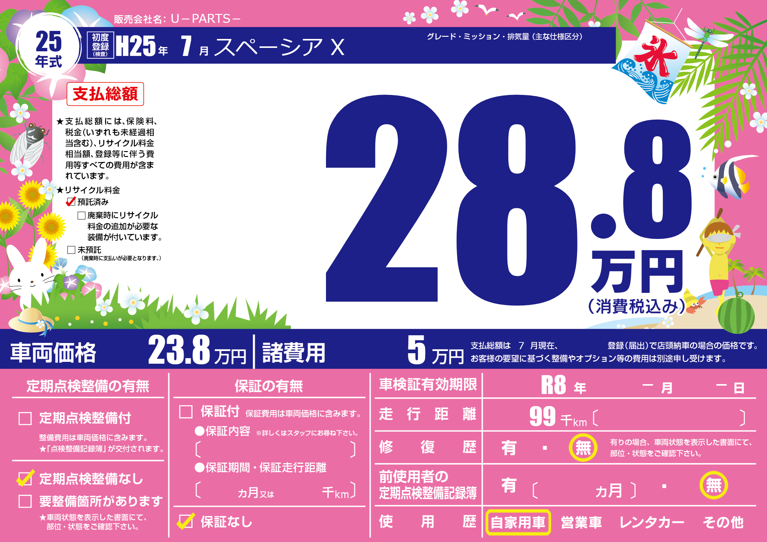 | 走行キロ | 9.9万km | 初年度登録 | H25年7月 |