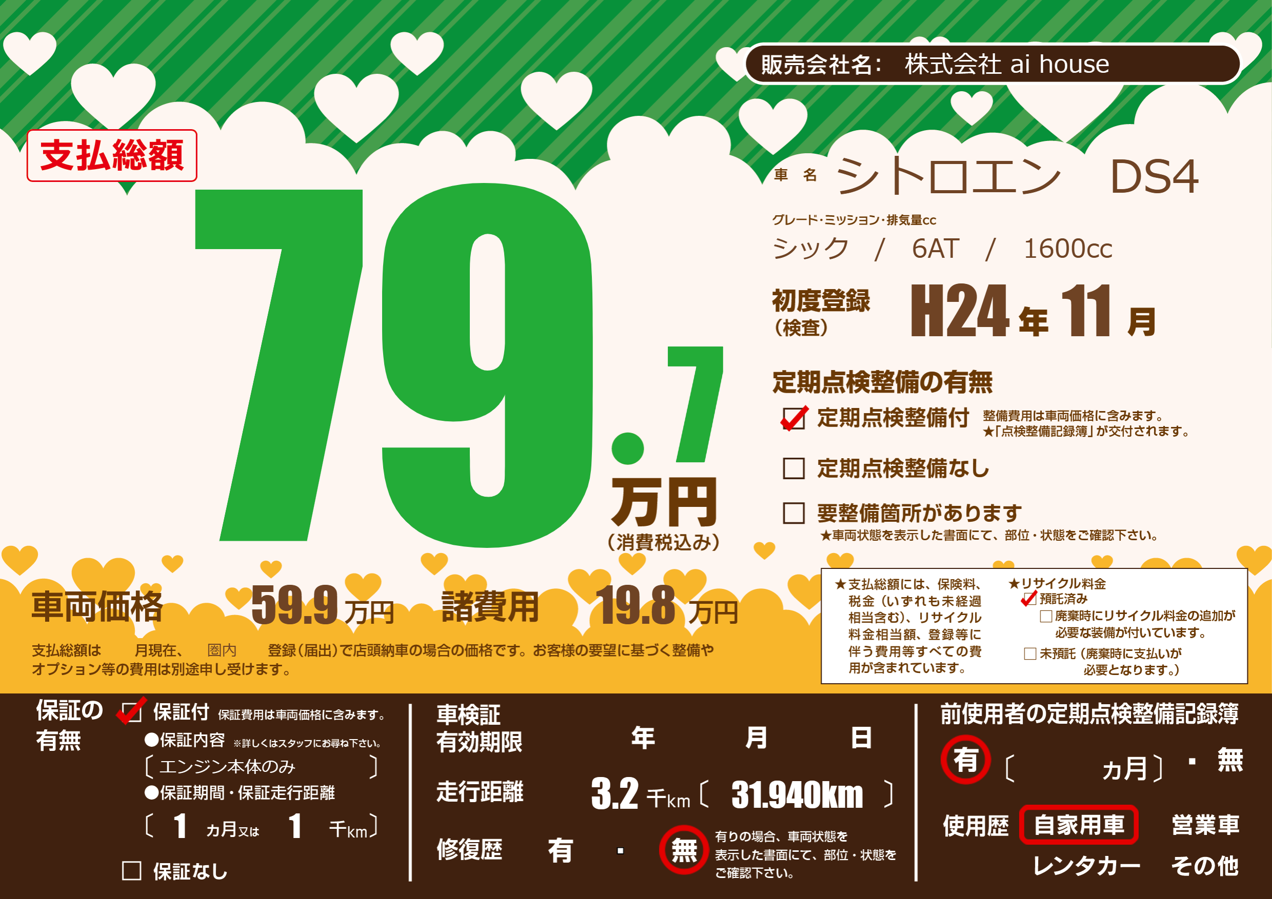 | 車名 | シトロエン DS4 | グレード ミッション 排気量 |