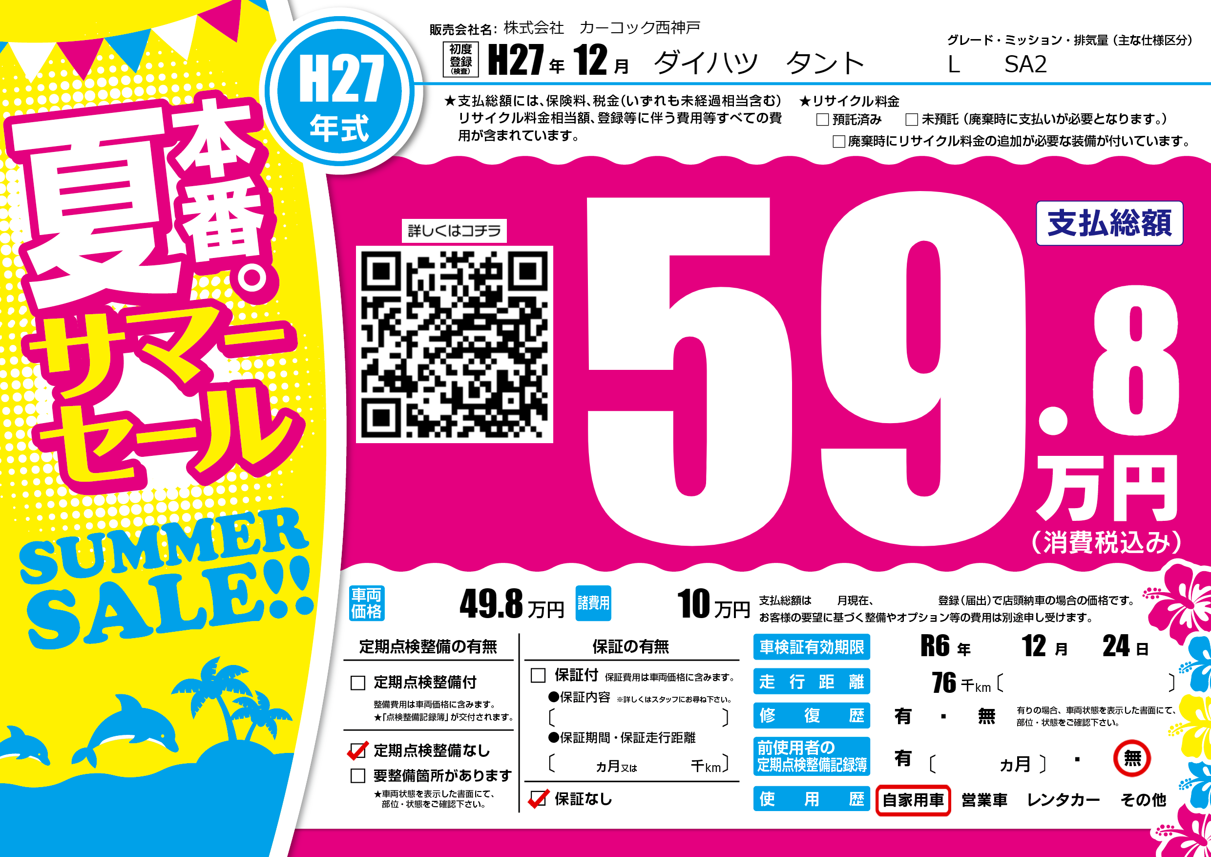 | 走行キロ | 7.6万km | 初年度登録 | H27年12月 |
