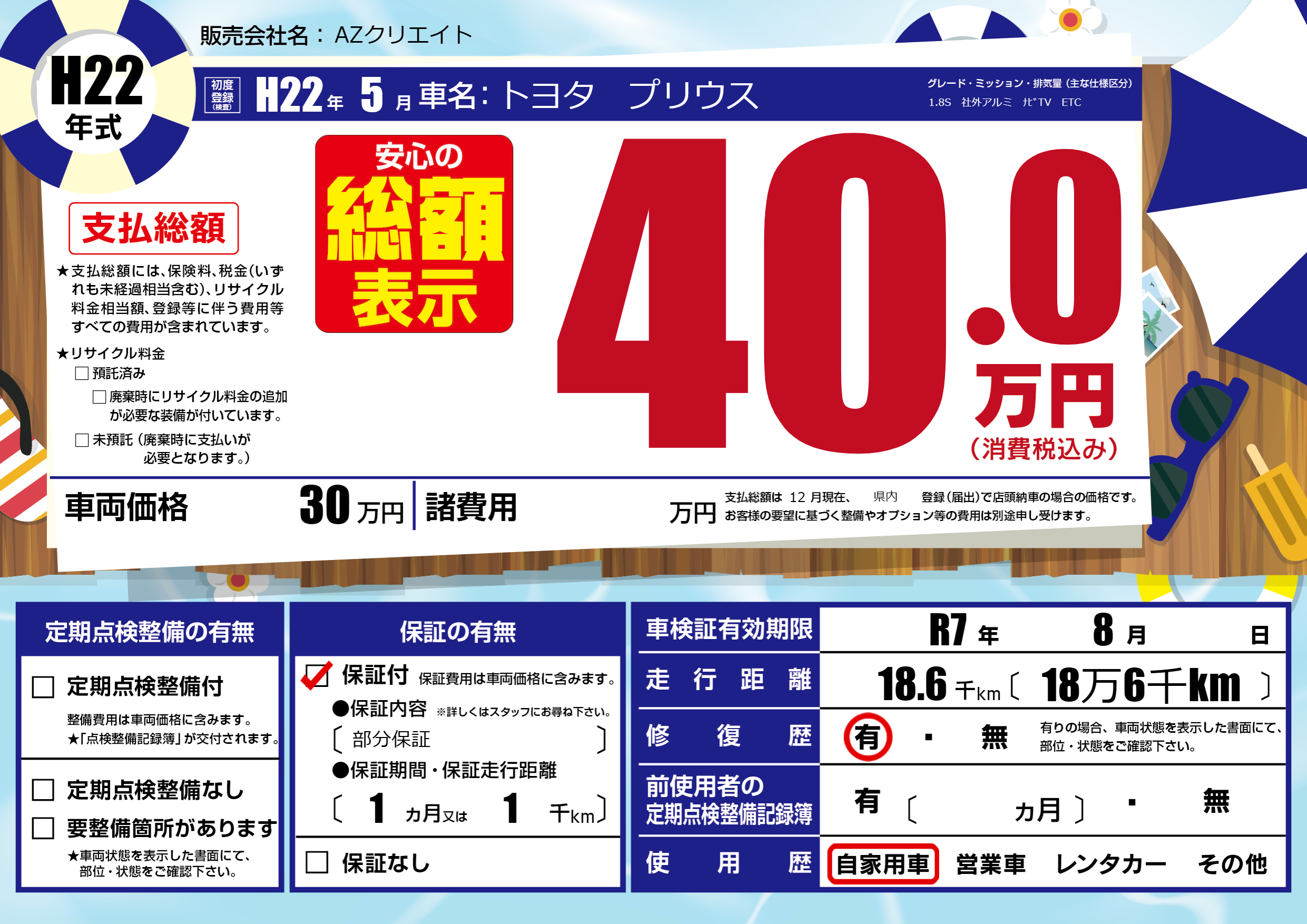 | 走行キロ | 1.8万km | 初年度登録 | H22年5月 |
