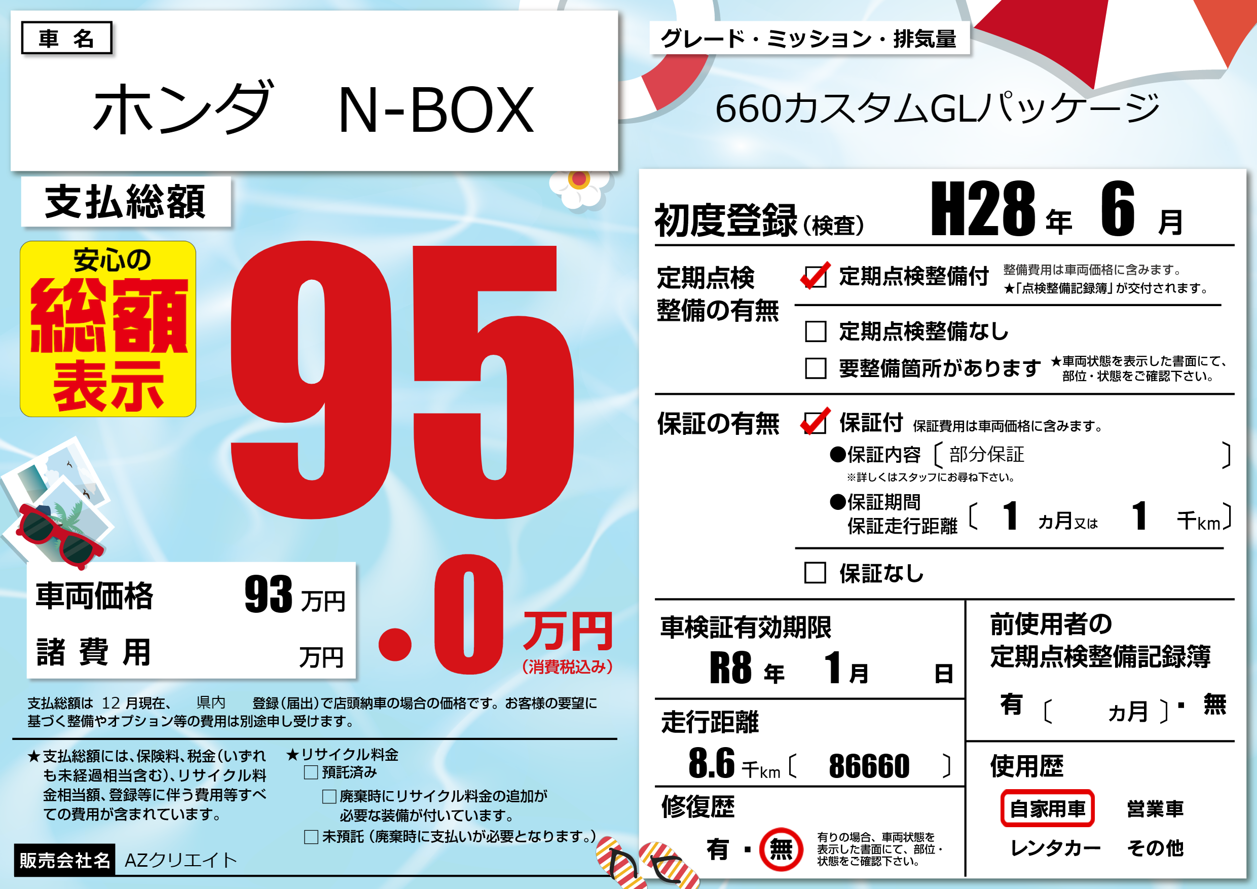 | 車名 | ホンダ N-BOX | グレード ミッション 排気量 |