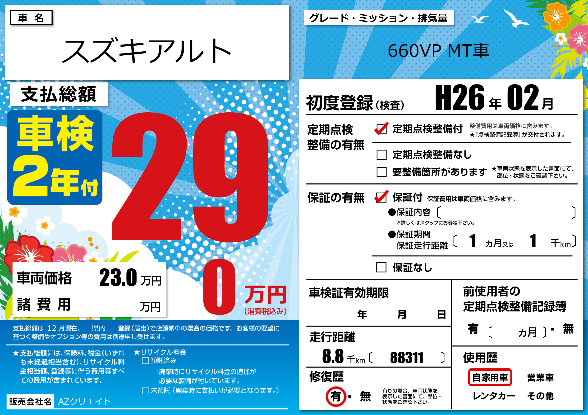 | 車名 | スズキアルト | グレード ミッション 排気量 |