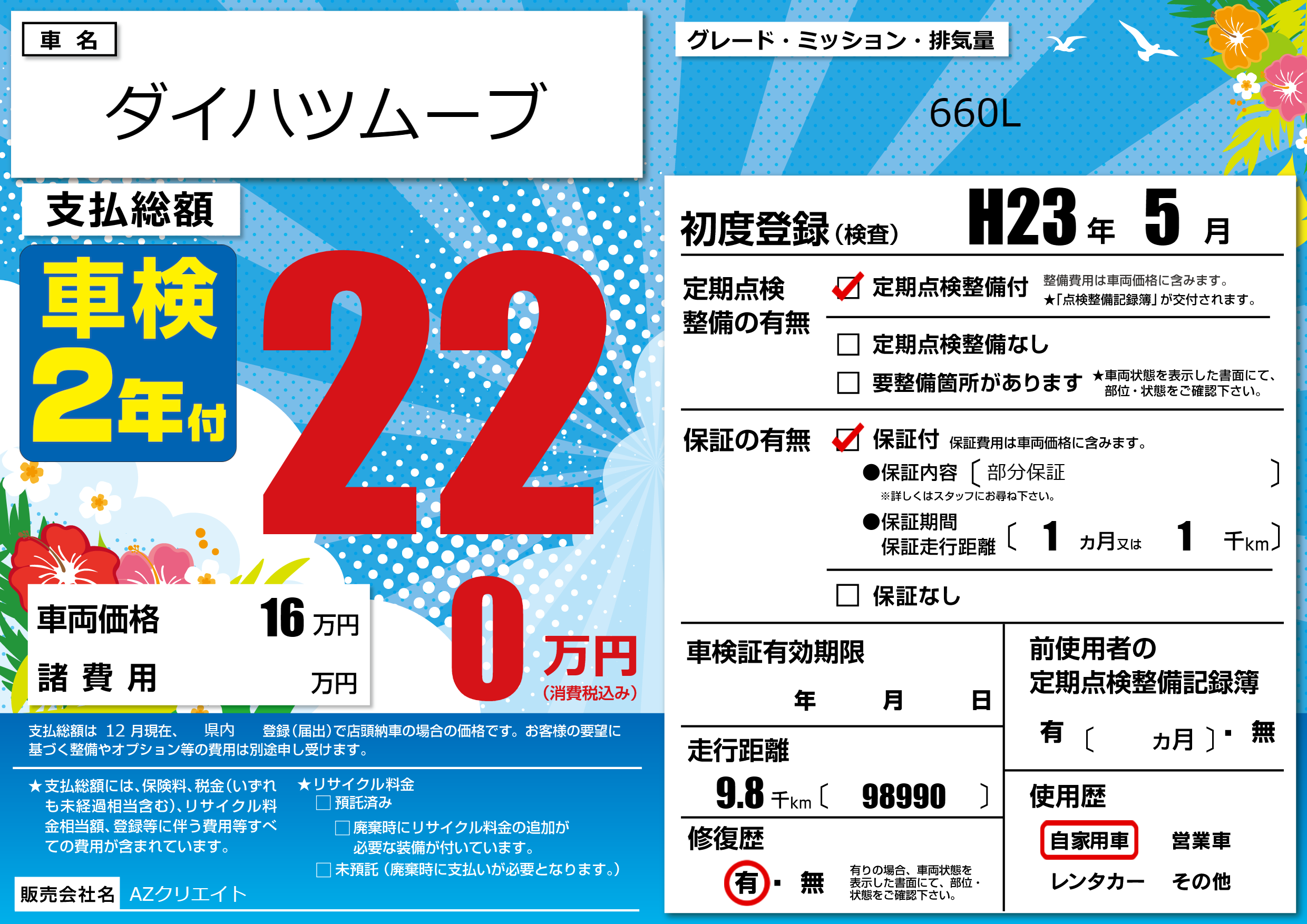 | 走行キロ | 0.9万km | 初年度登録 | H23年5月 |