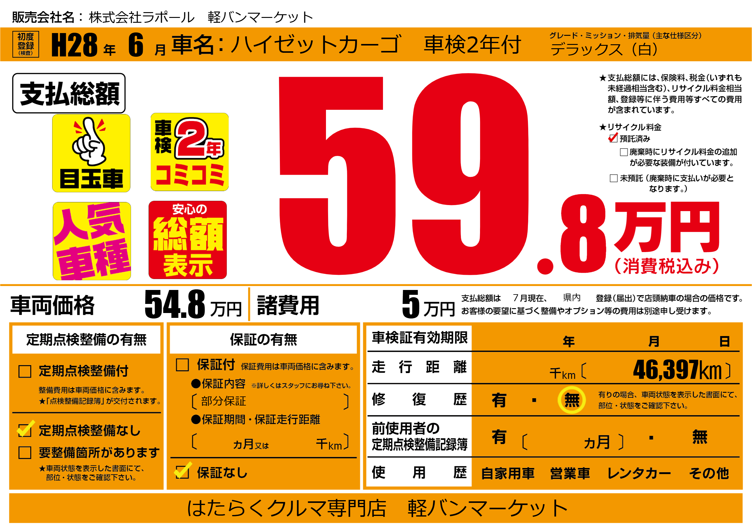 | 車名 | ハイゼットカーゴ 車検2年付 | グレード ミッション 排気量 |