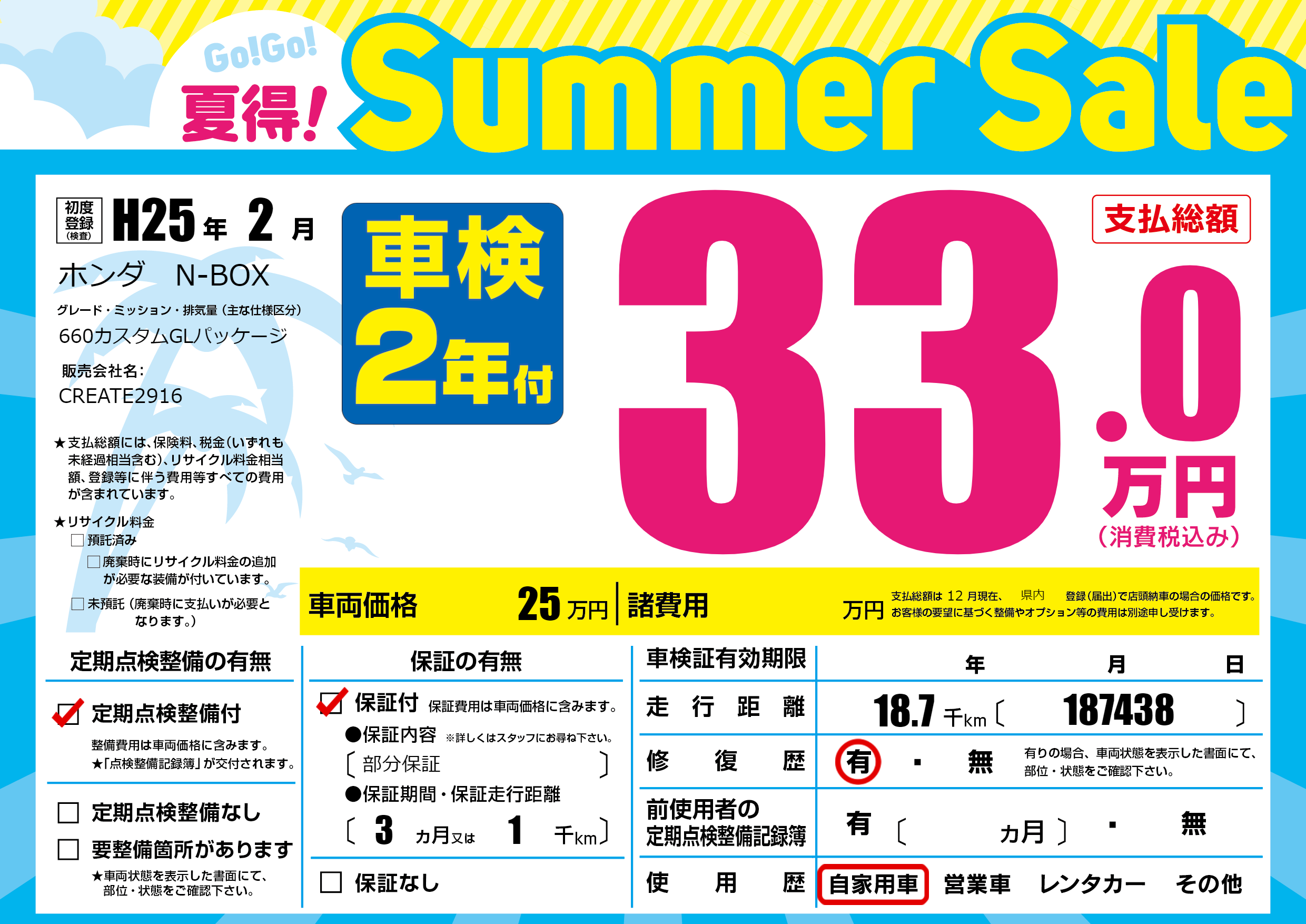 | 車名 | ホンダ N-BOX | グレード ミッション 排気量 |