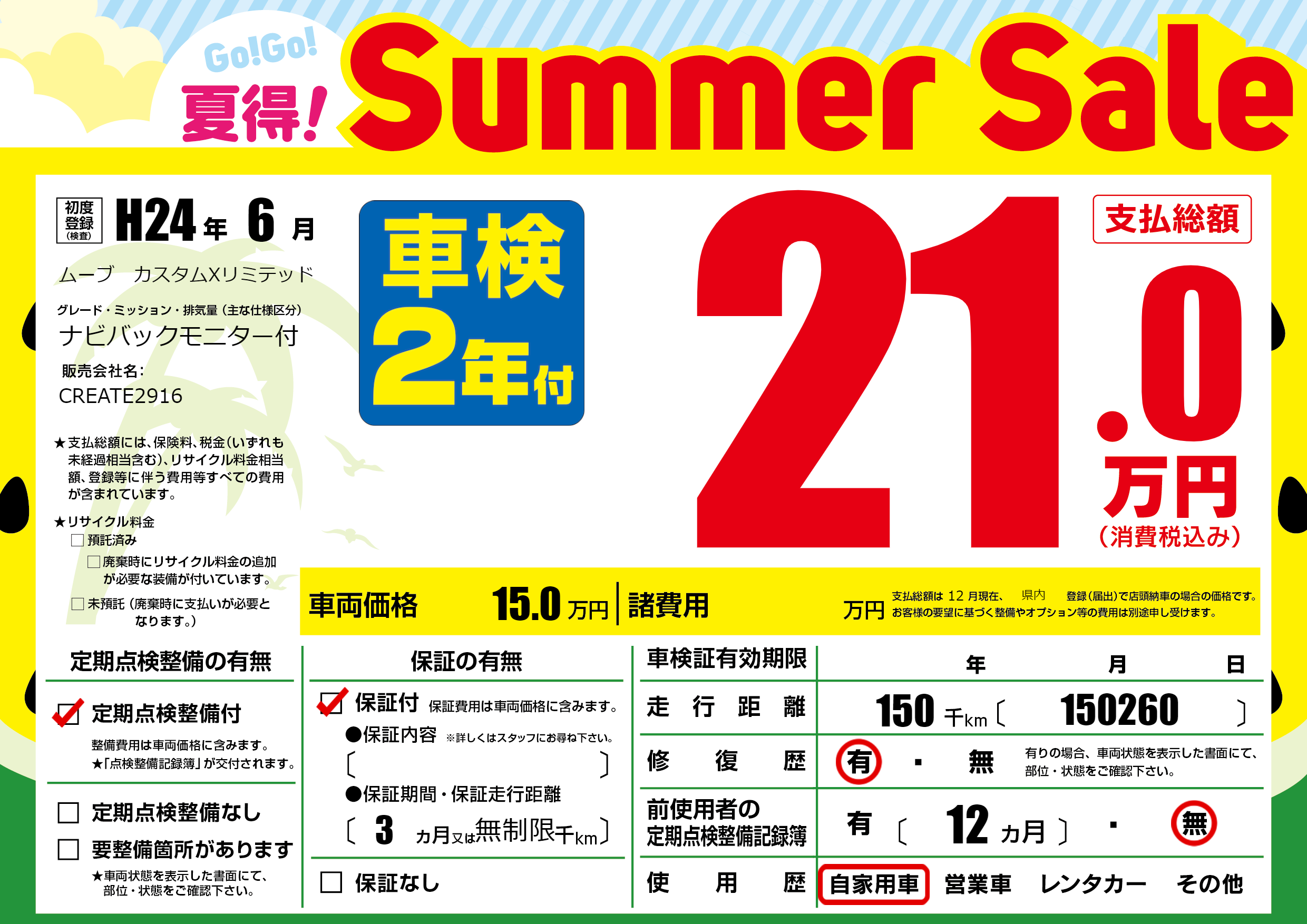 | 走行キロ | 15万km | 初年度登録 | H24年6月 |