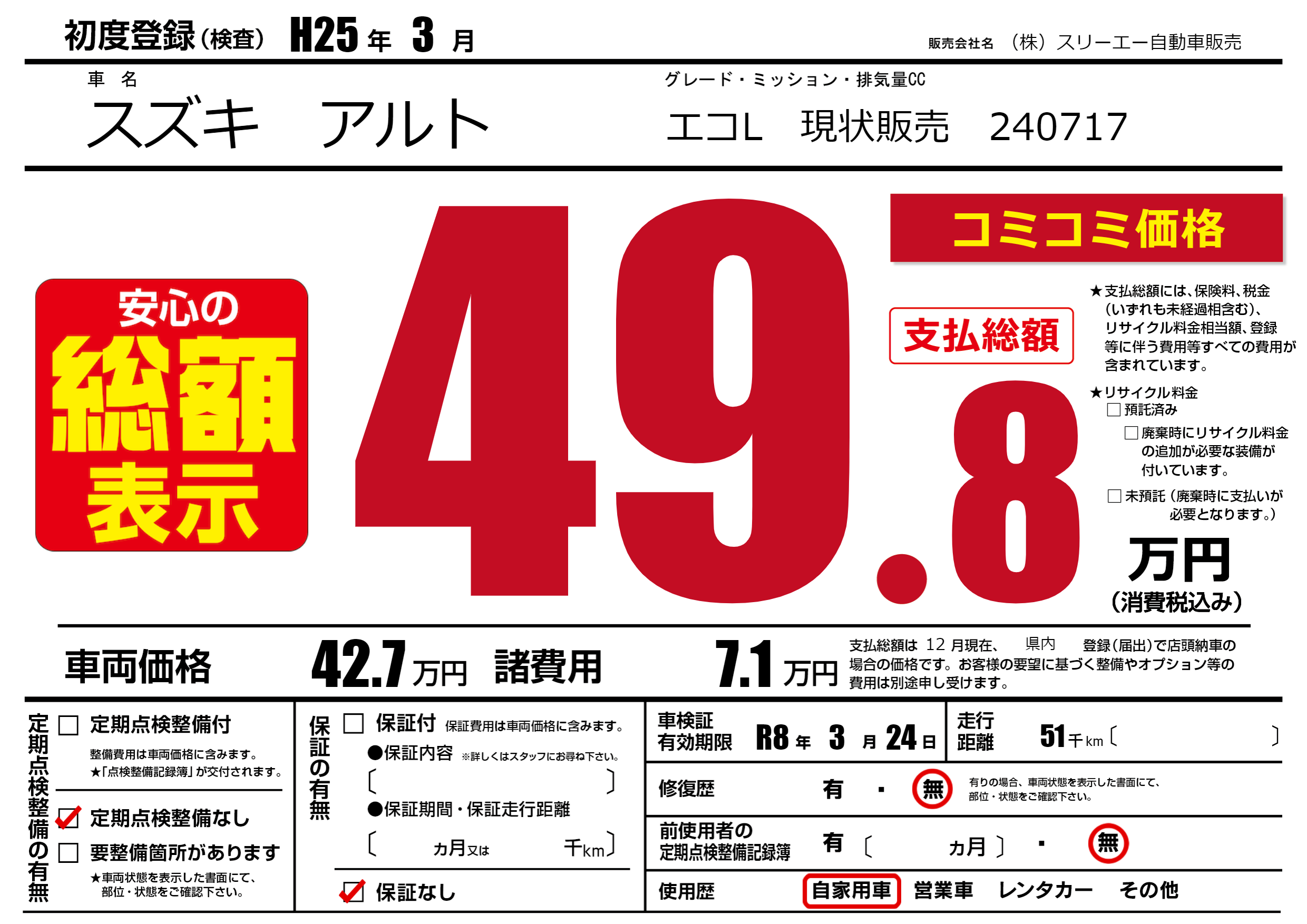 | 車名 | スズキ アルト | グレード ミッション 排気量 |