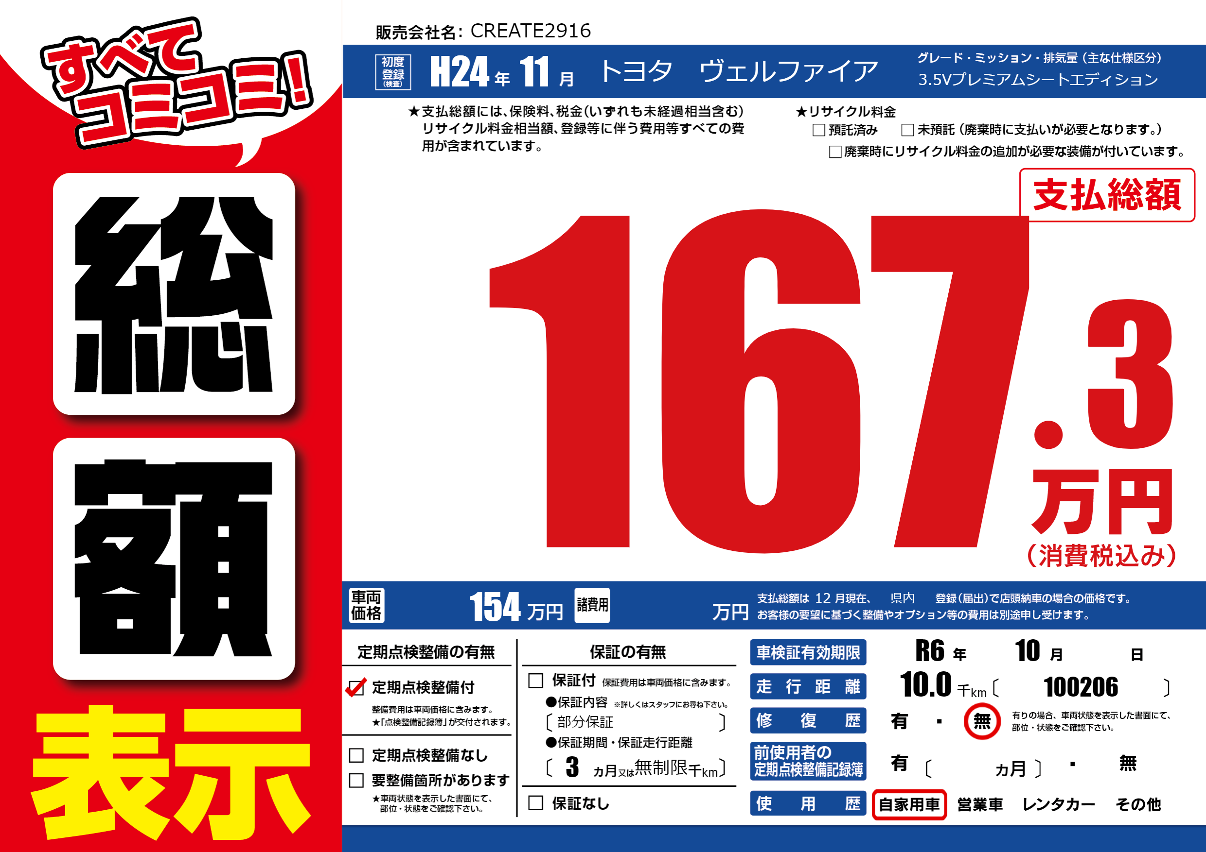 | 車名 | トヨタ ヴェルファイア | グレード ミッション 排気量 |