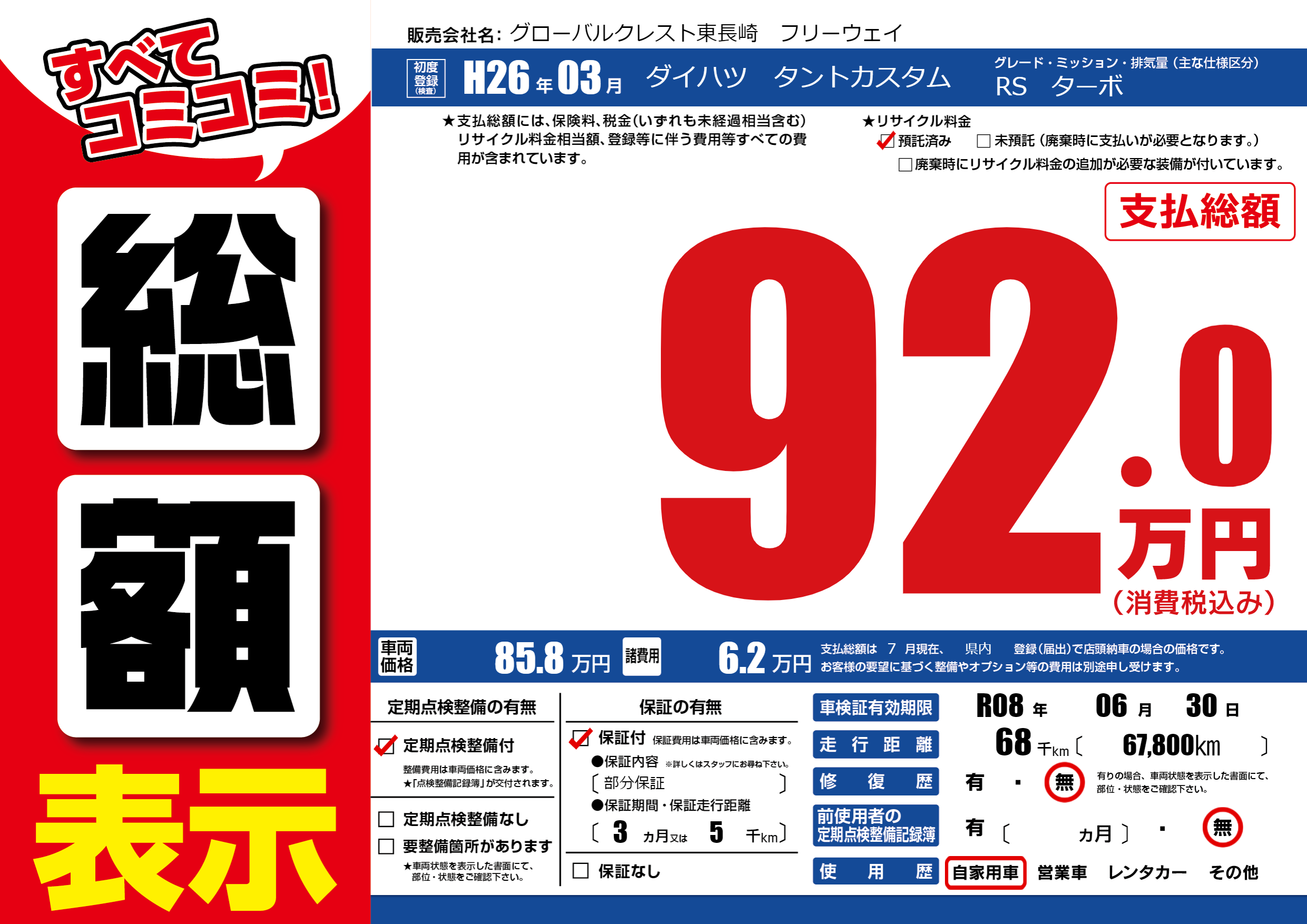 | 走行キロ | 6.8万km | 初年度登録 | H26年03月 |