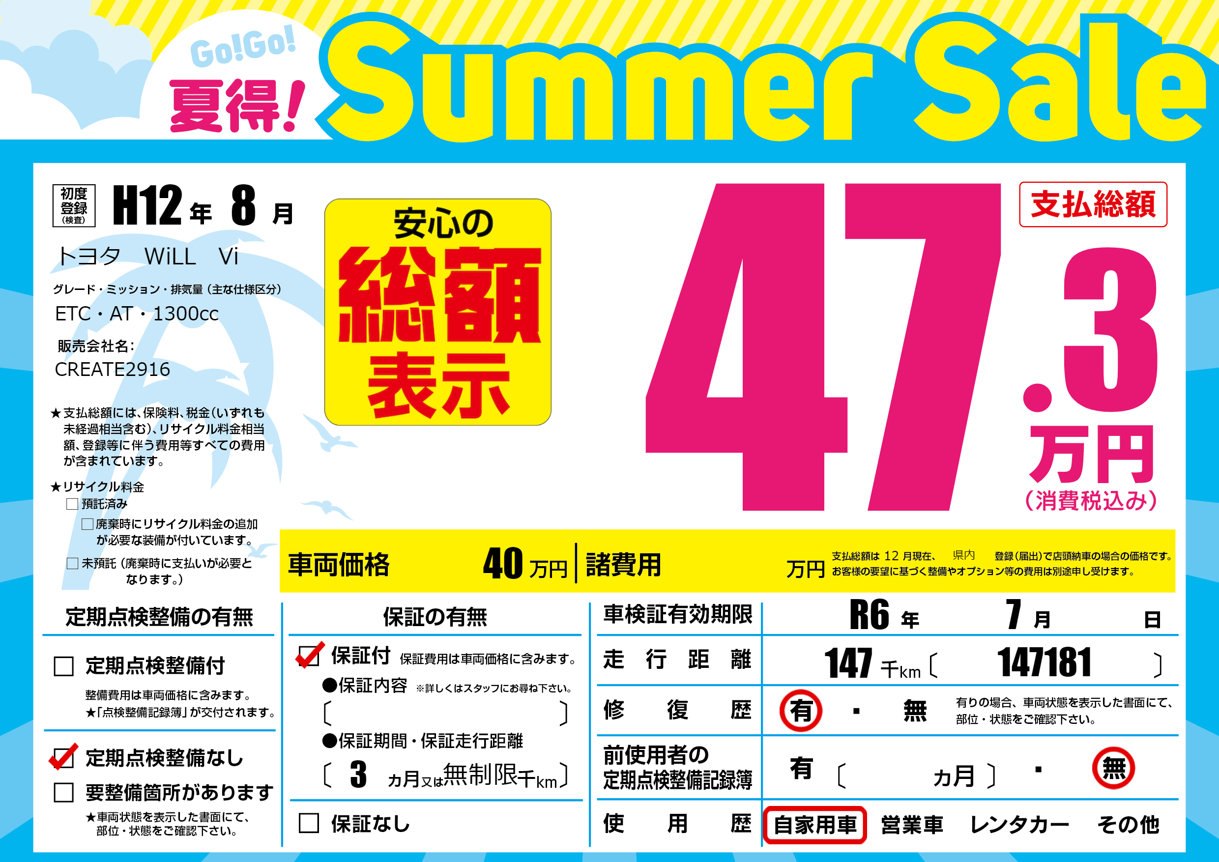 | 走行キロ | 14.7万km | 初年度登録 | H12年8月 |