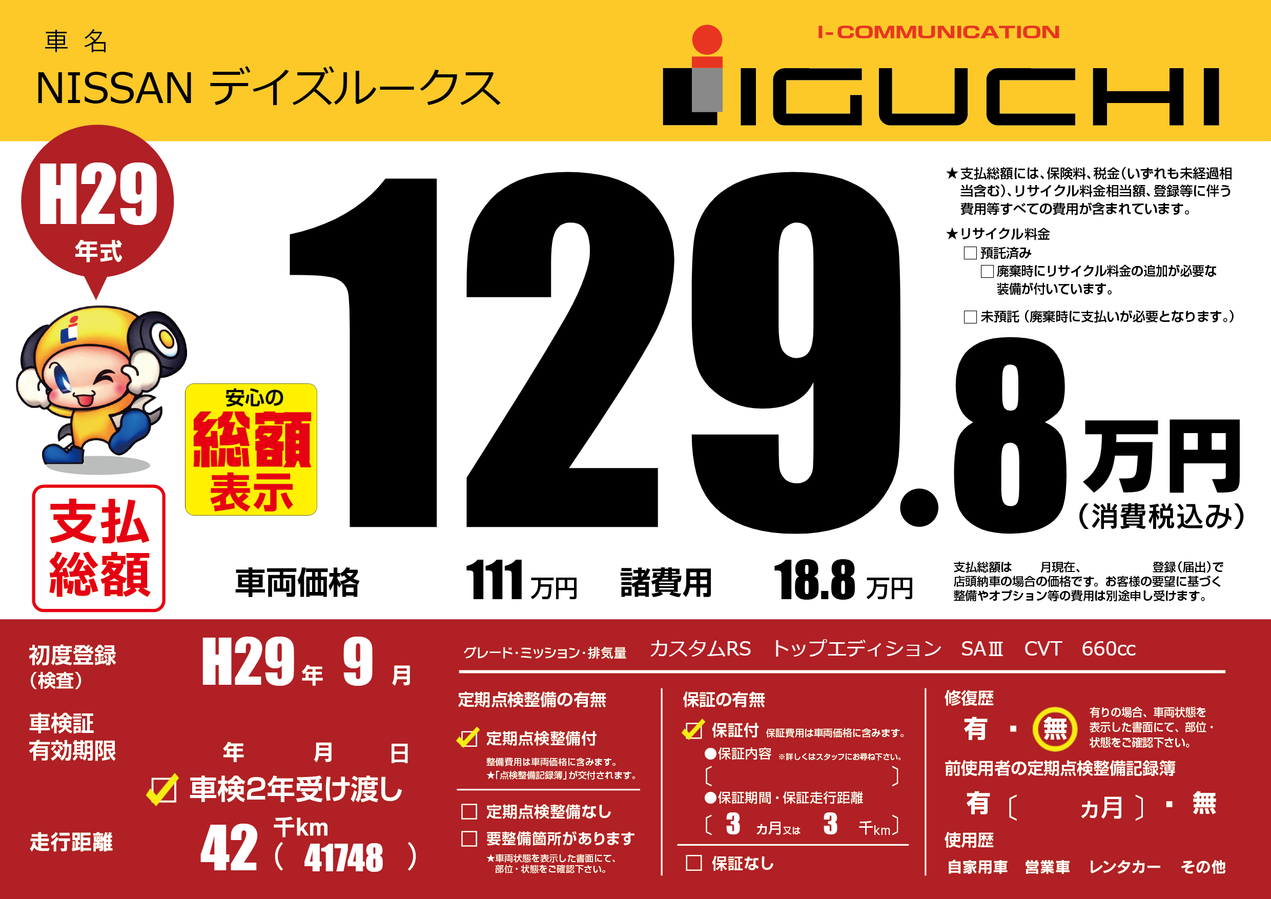 | 走行キロ | 4.2万km | 初年度登録 | H29年9月 |