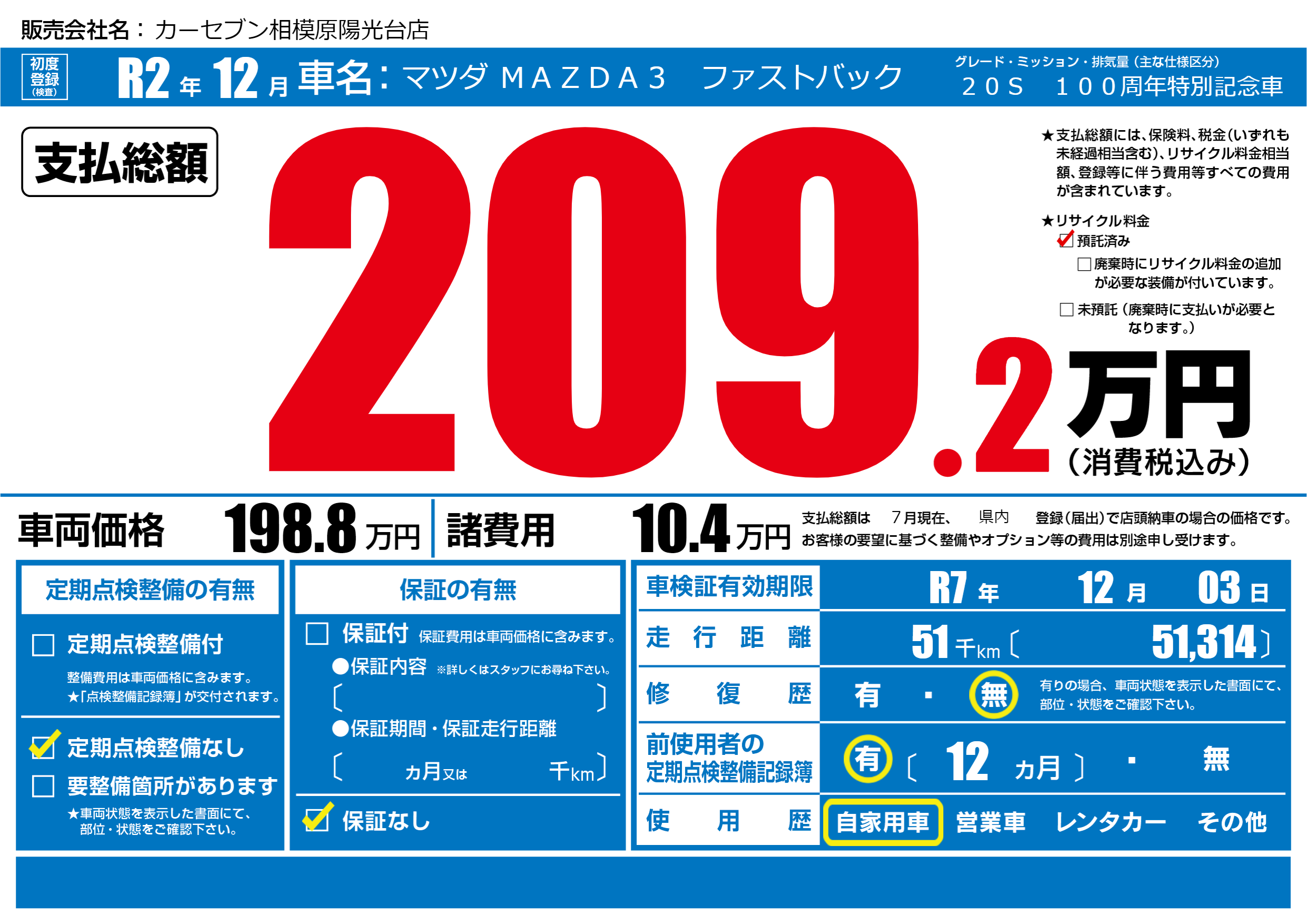 | 車検制限 | R7年 12月 03日 | ||