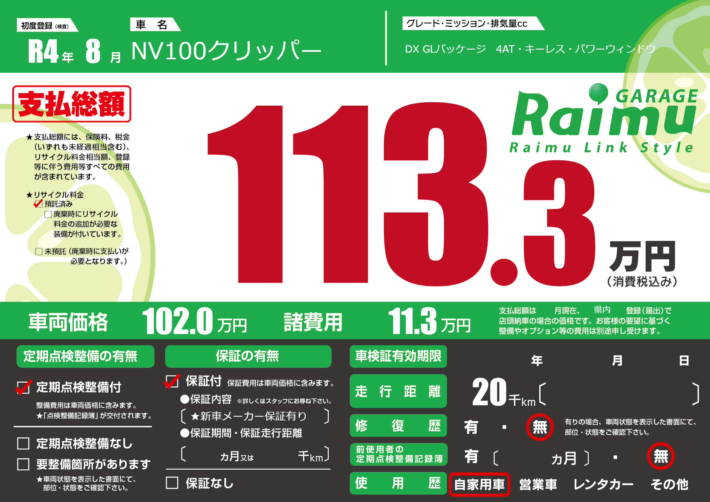 保証付き 保証内容(★新車メーカー保証有り) ヶ月または千km |
