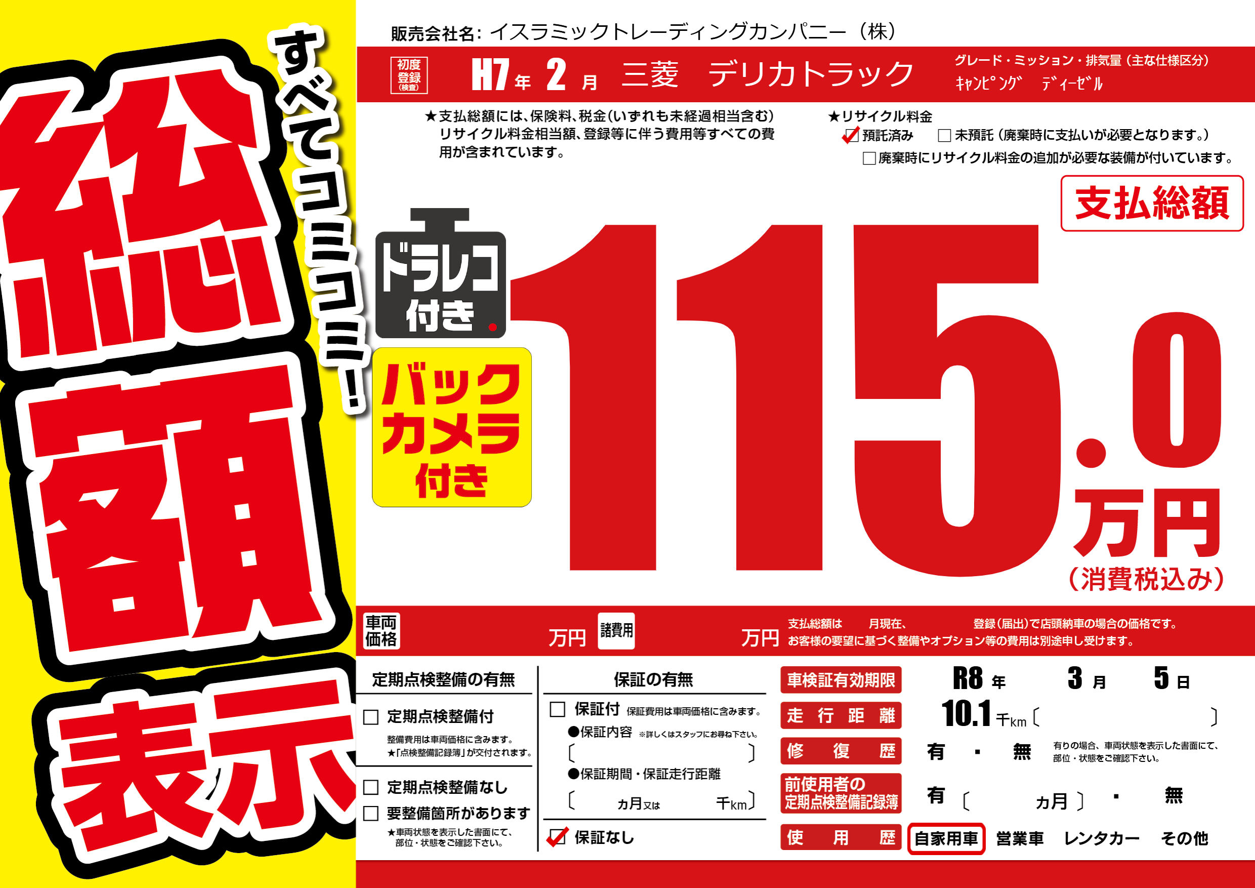 | 走行キロ | 1万km | 初年度登録 | H7年2月 |