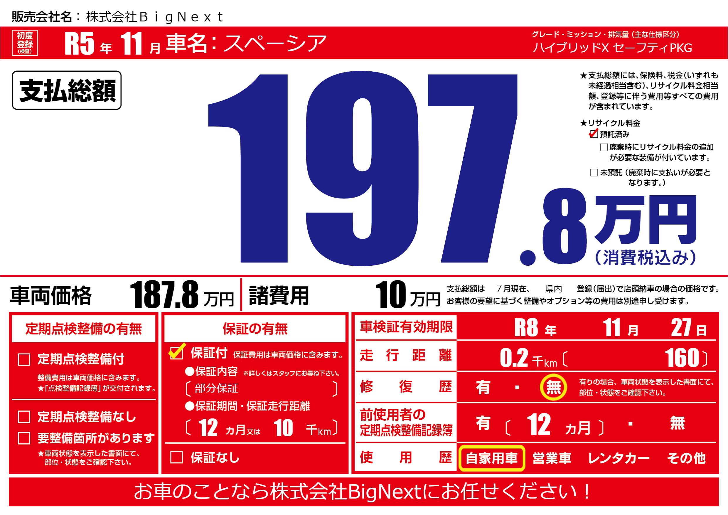 | 車名 | スペーシア | グレード ミッション 排気量 |