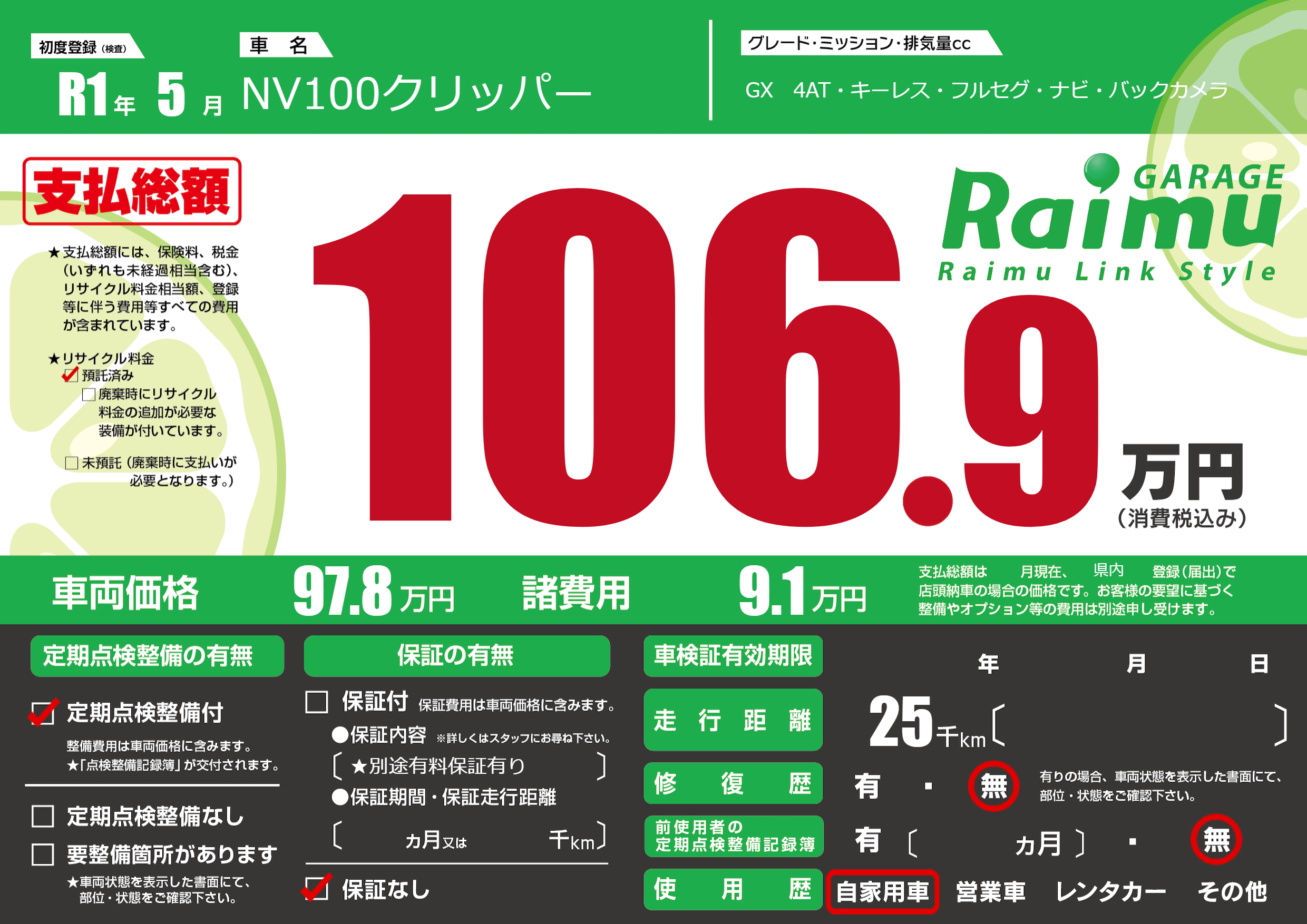 保証なし 保証内容(★別途有料保証有り) ---ヶ月または()千kmまで |