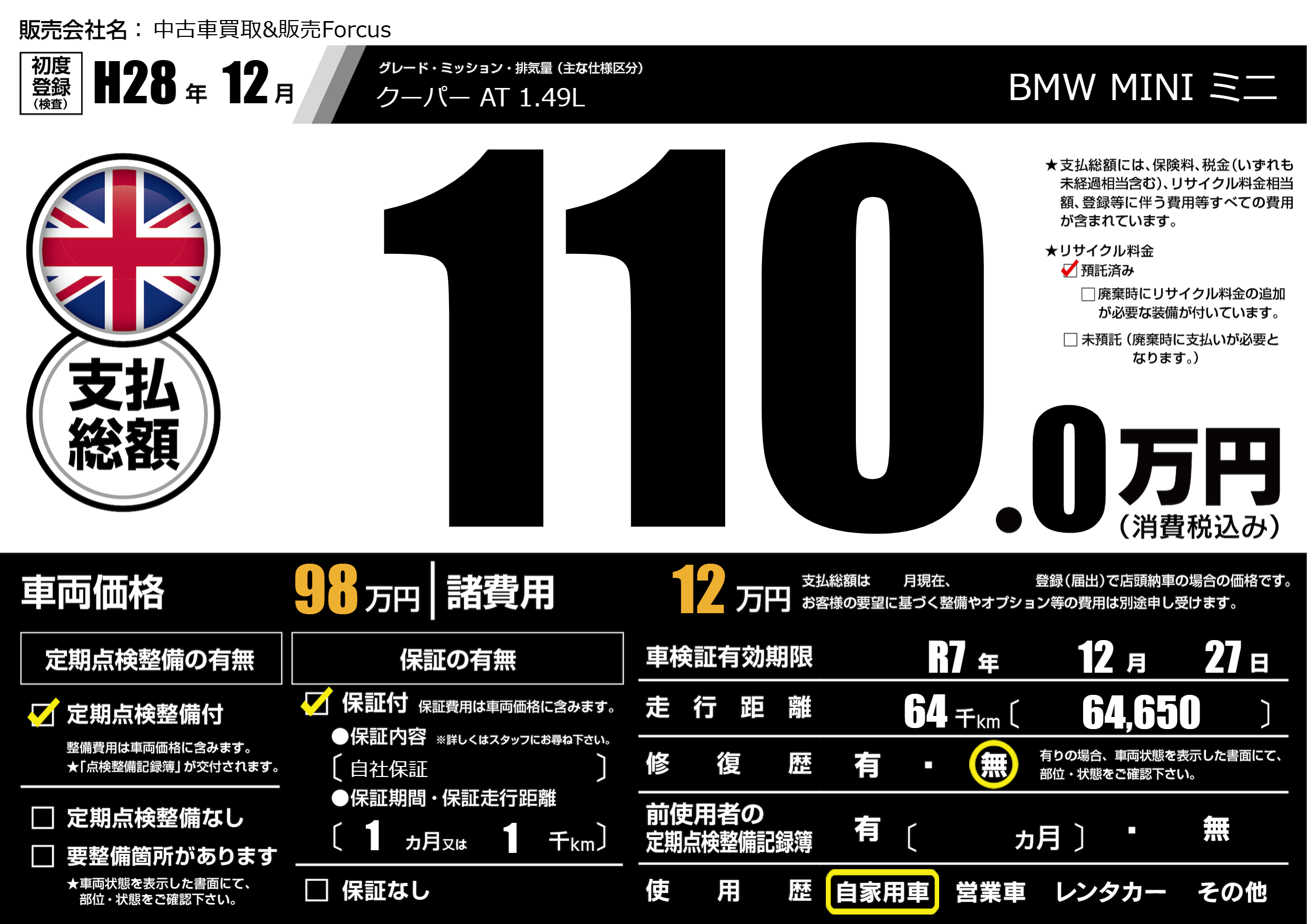 なし | 車検制限 | R7年12月27月 |