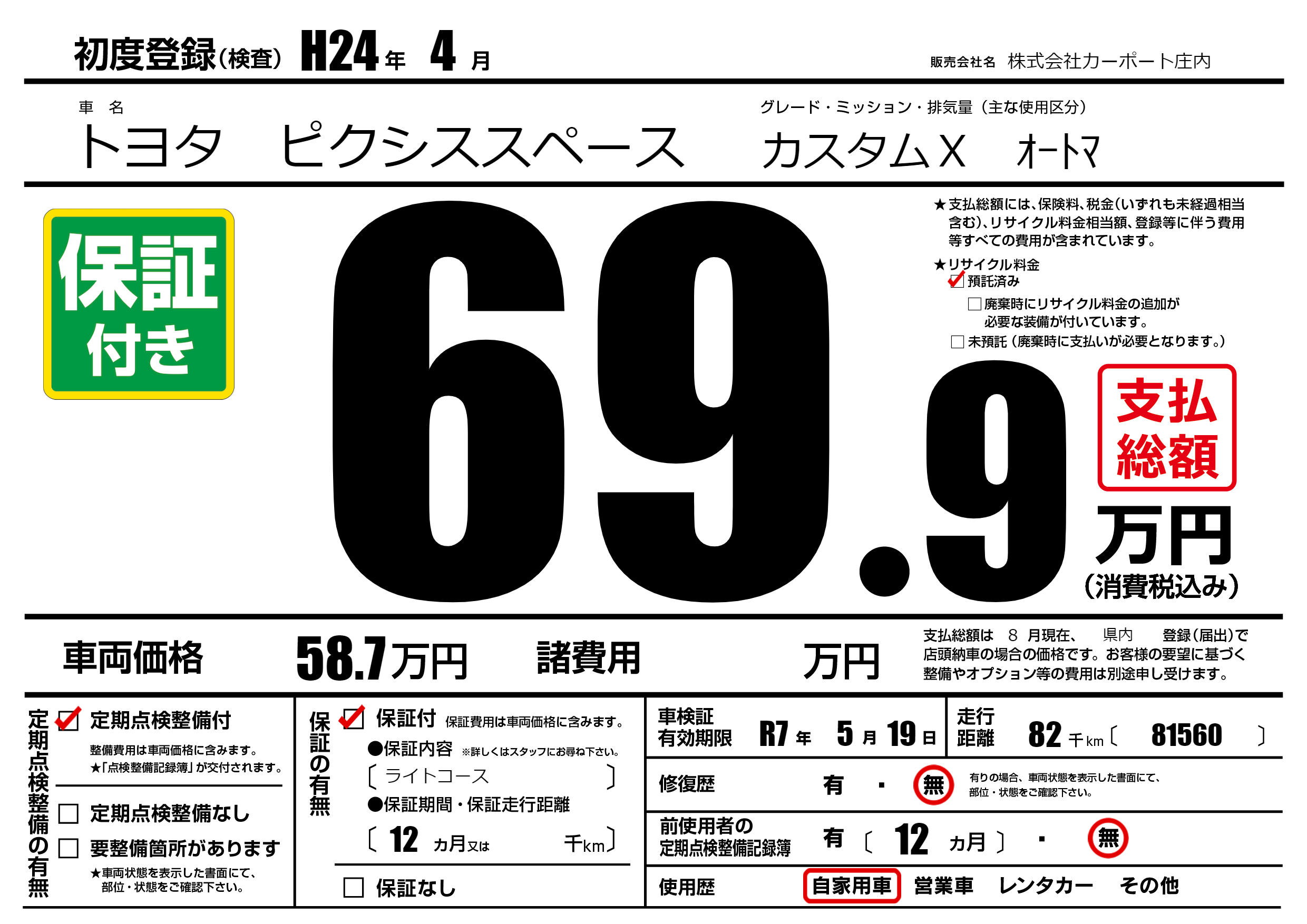 | 車名 | トヨタ ピクシススペース | グレード ミッション 排気量 |
