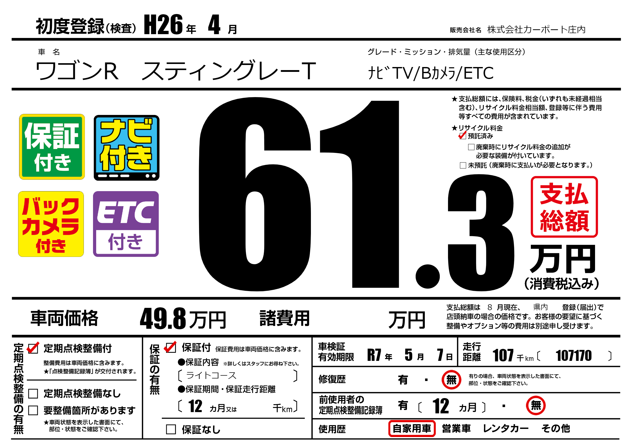| 走行キロ | 10.7万km | 初年度登録 | H26年4月 |