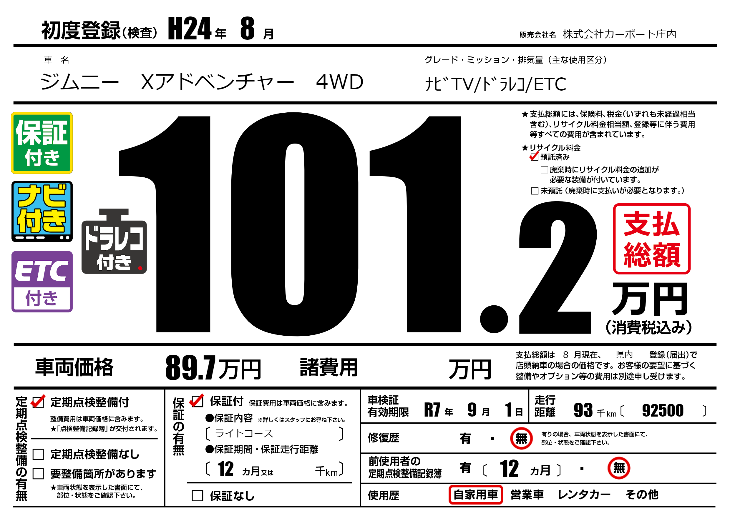 なし | 車検制限 | R7年9月1月 |