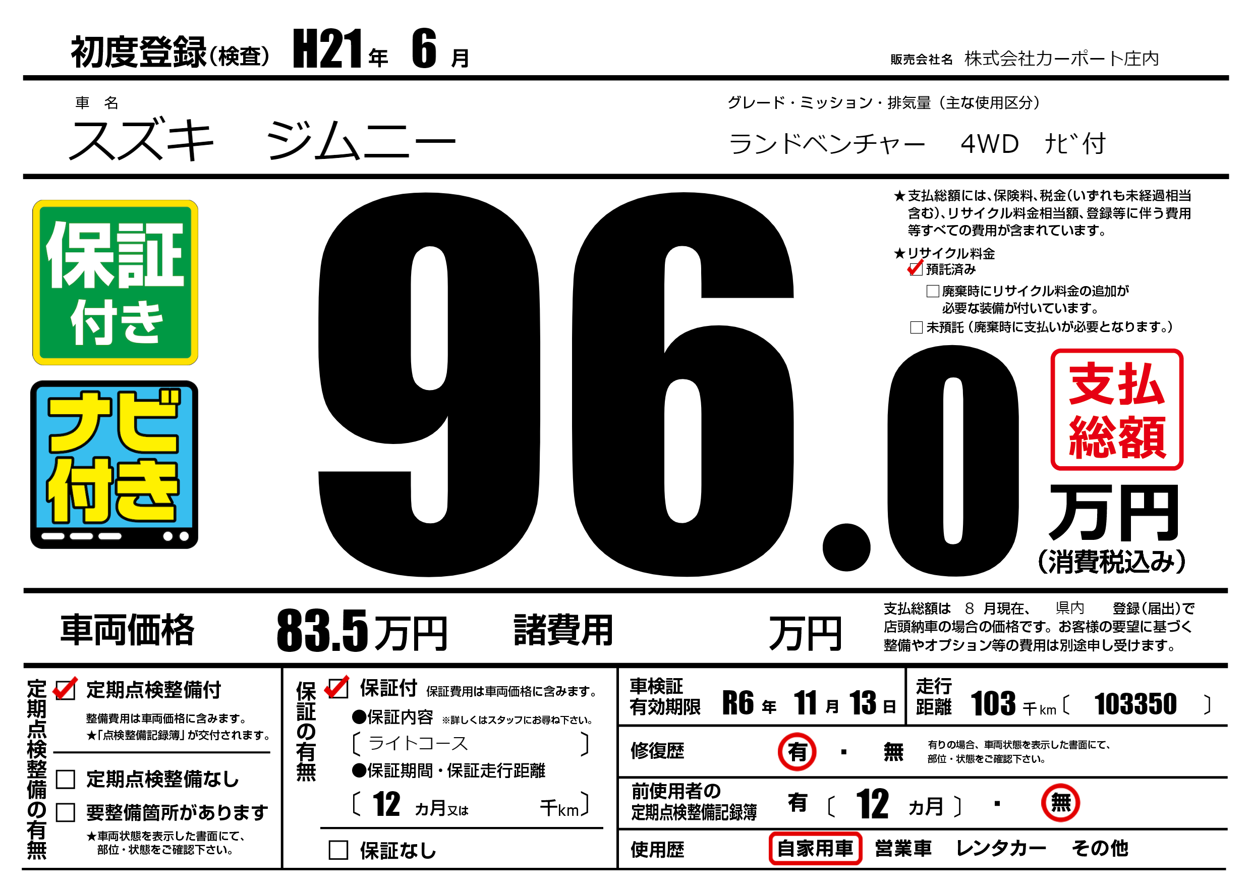 | 走行キロ | 10.3万km | 初年度登録 | H21年6月 |
