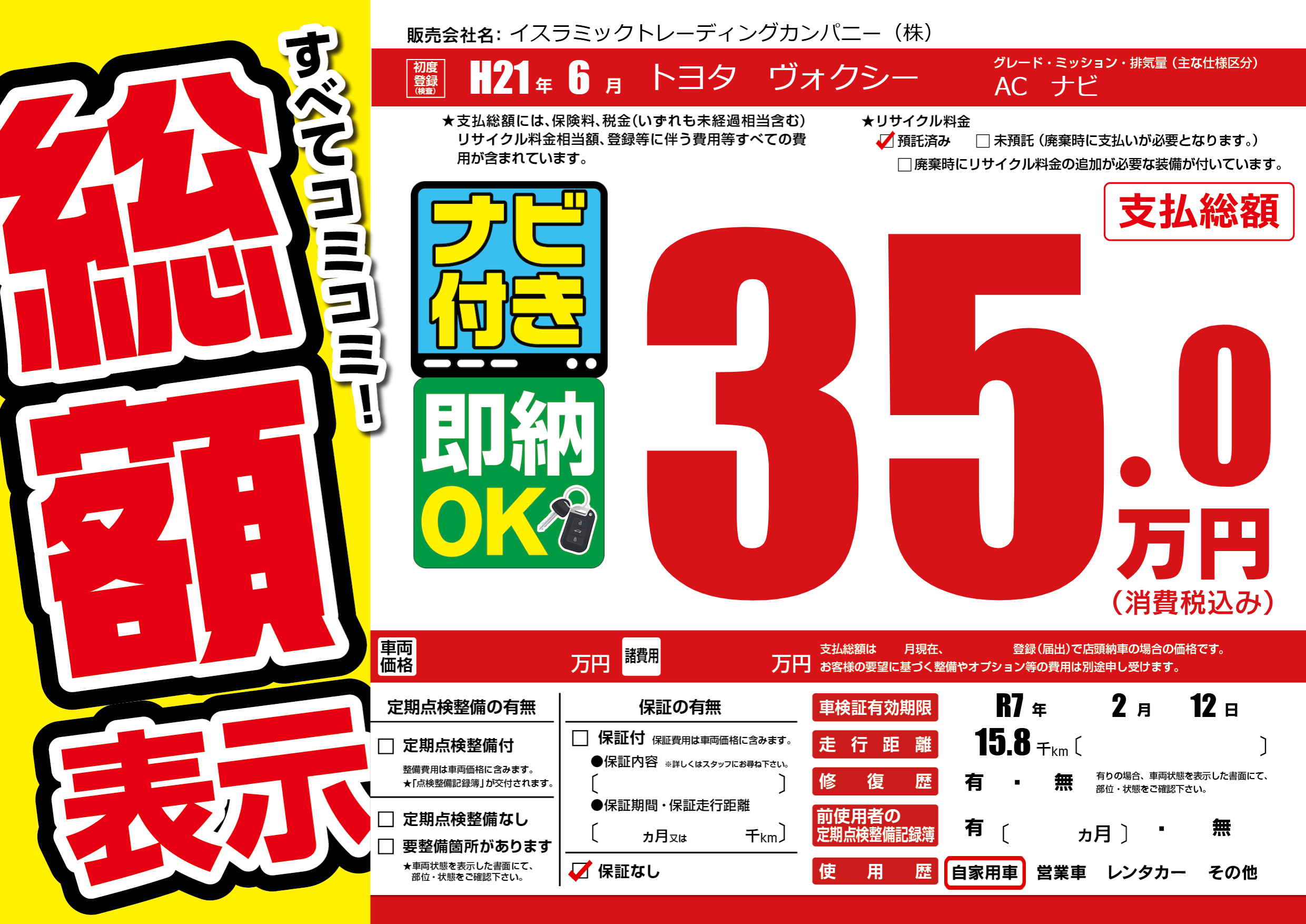 | 車名 | トヨタ ヴォクシー | グレード ミッション 排気量 |