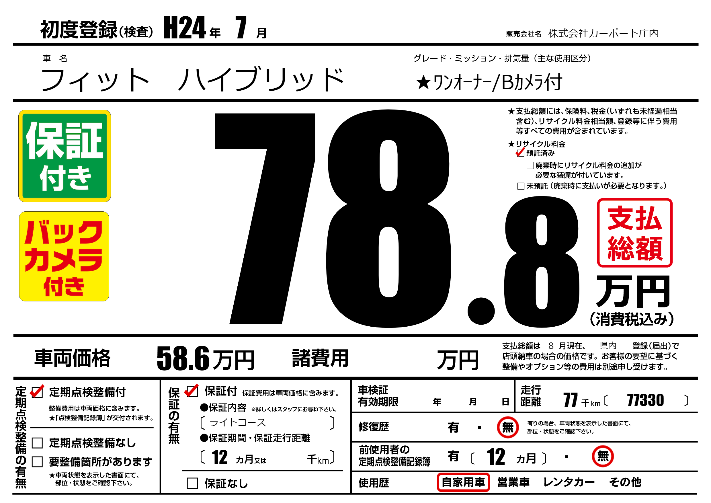 | 走行キロ | 7.7万km | 初年度登録 | H24年7月 |