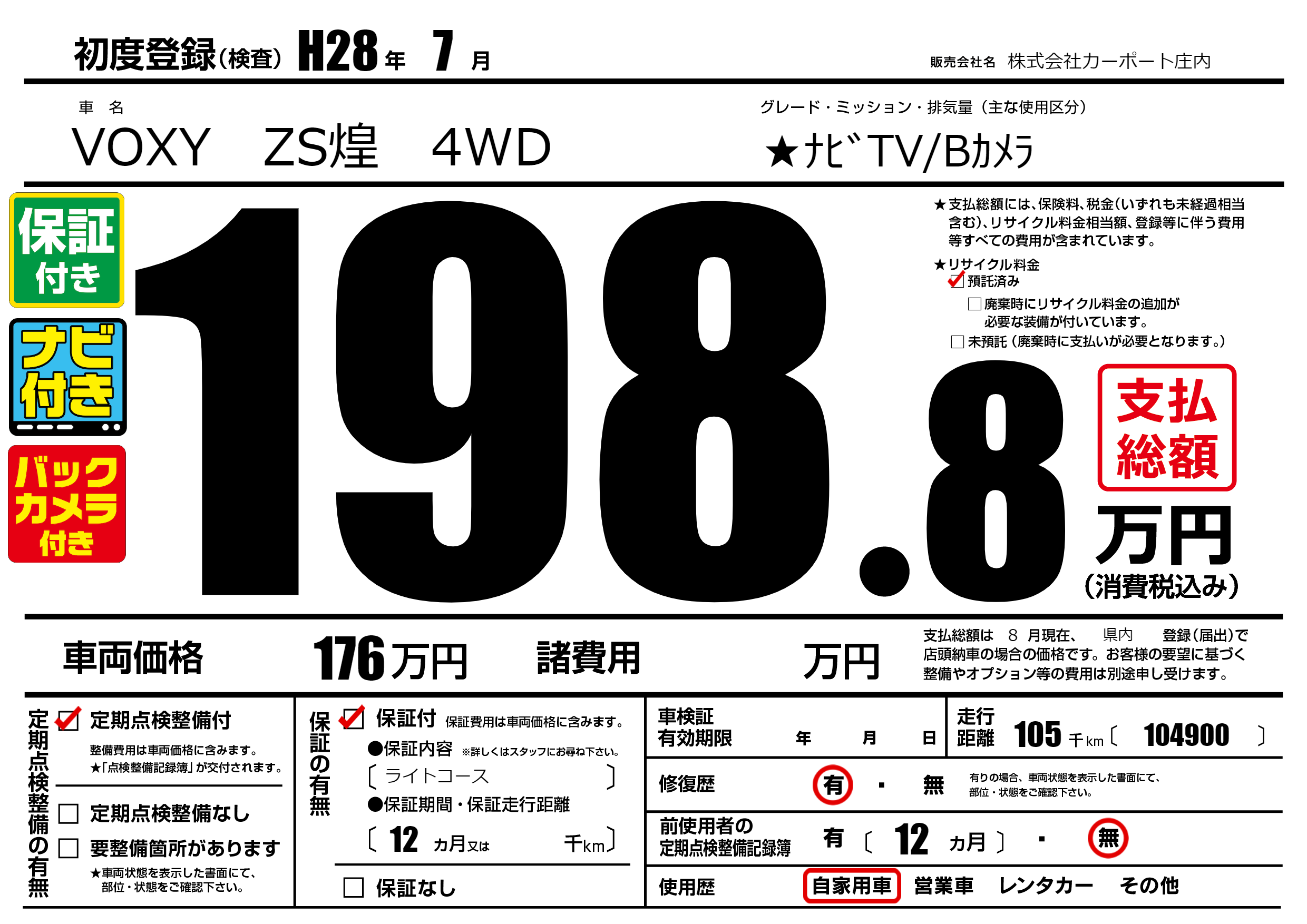 | 車名 | VOXY ZS煌 4WD | グレード ミッション 排気量 |
