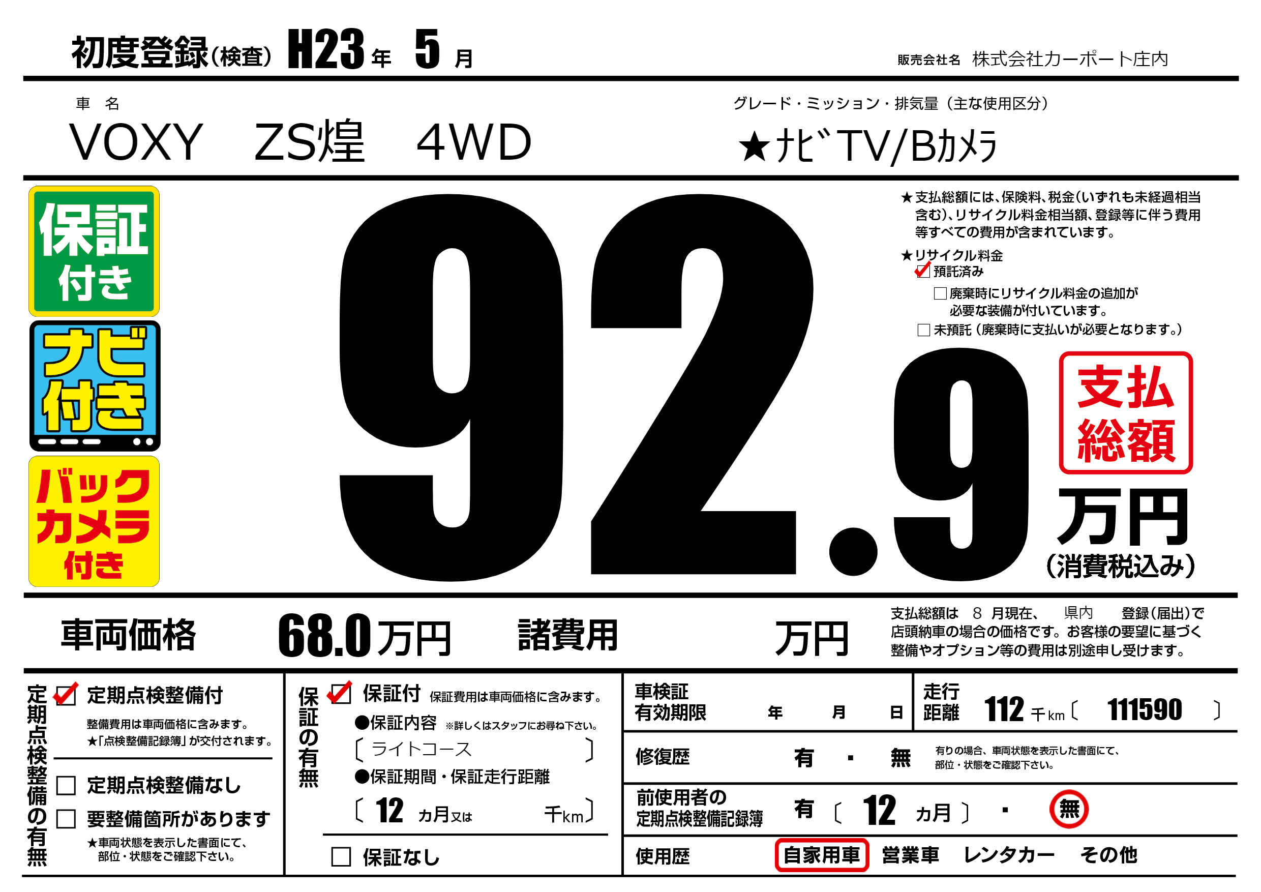 | 走行キロ | 11.2万km | 初年度登録 | H23年5月 |