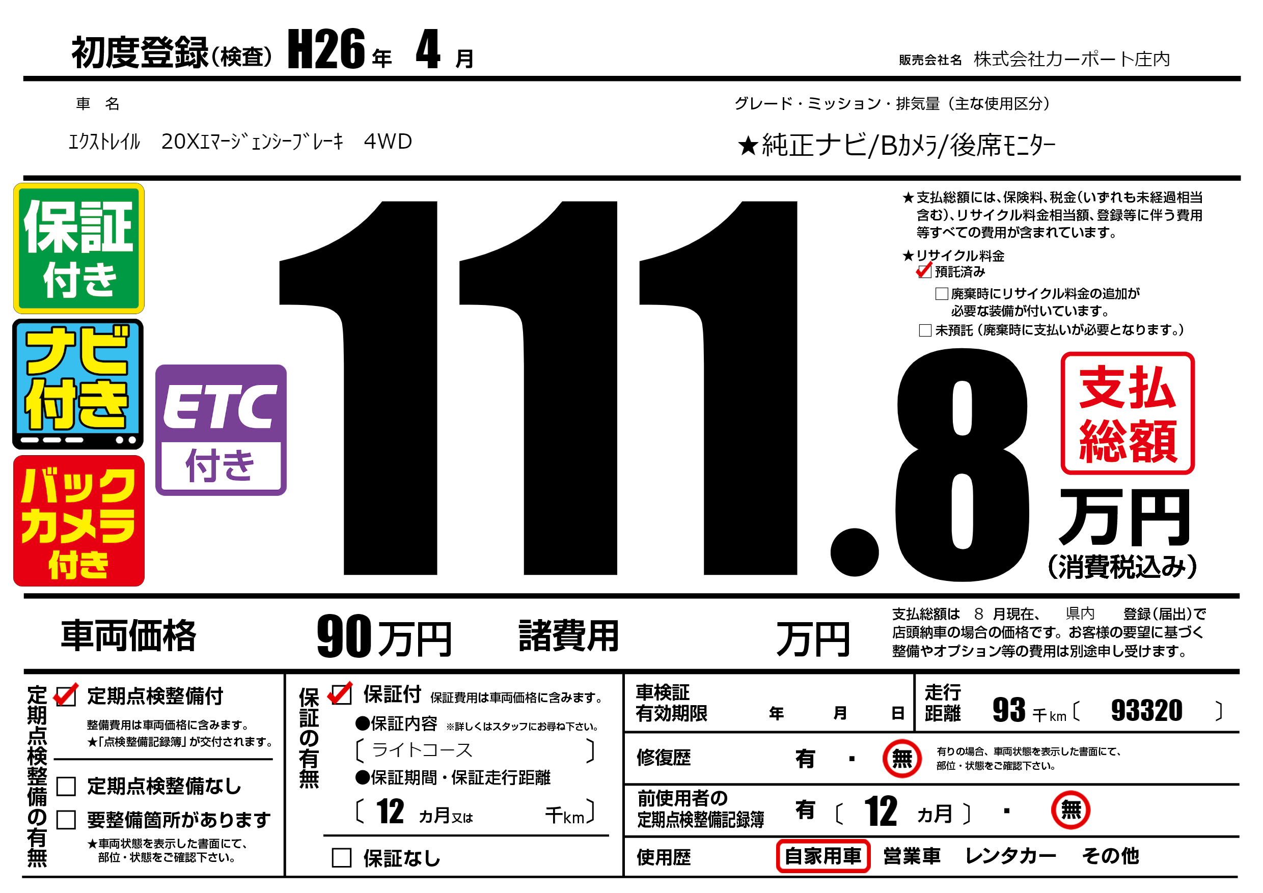 | 走行キロ | 9.3万km | 初年度登録 | H26年4月 |