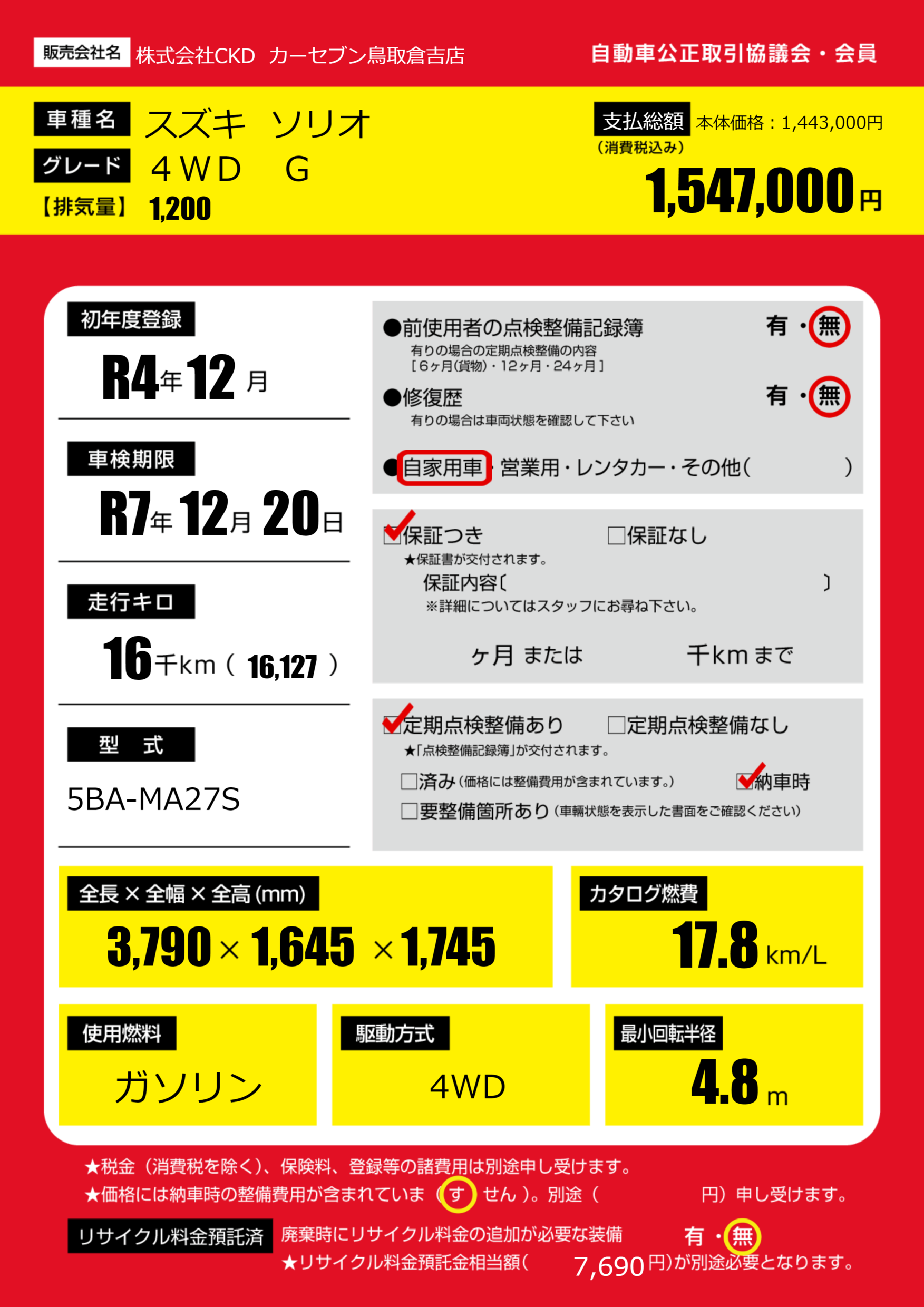 | 車名 | スズキ ソリオ | グレード ミッション 排気量 |