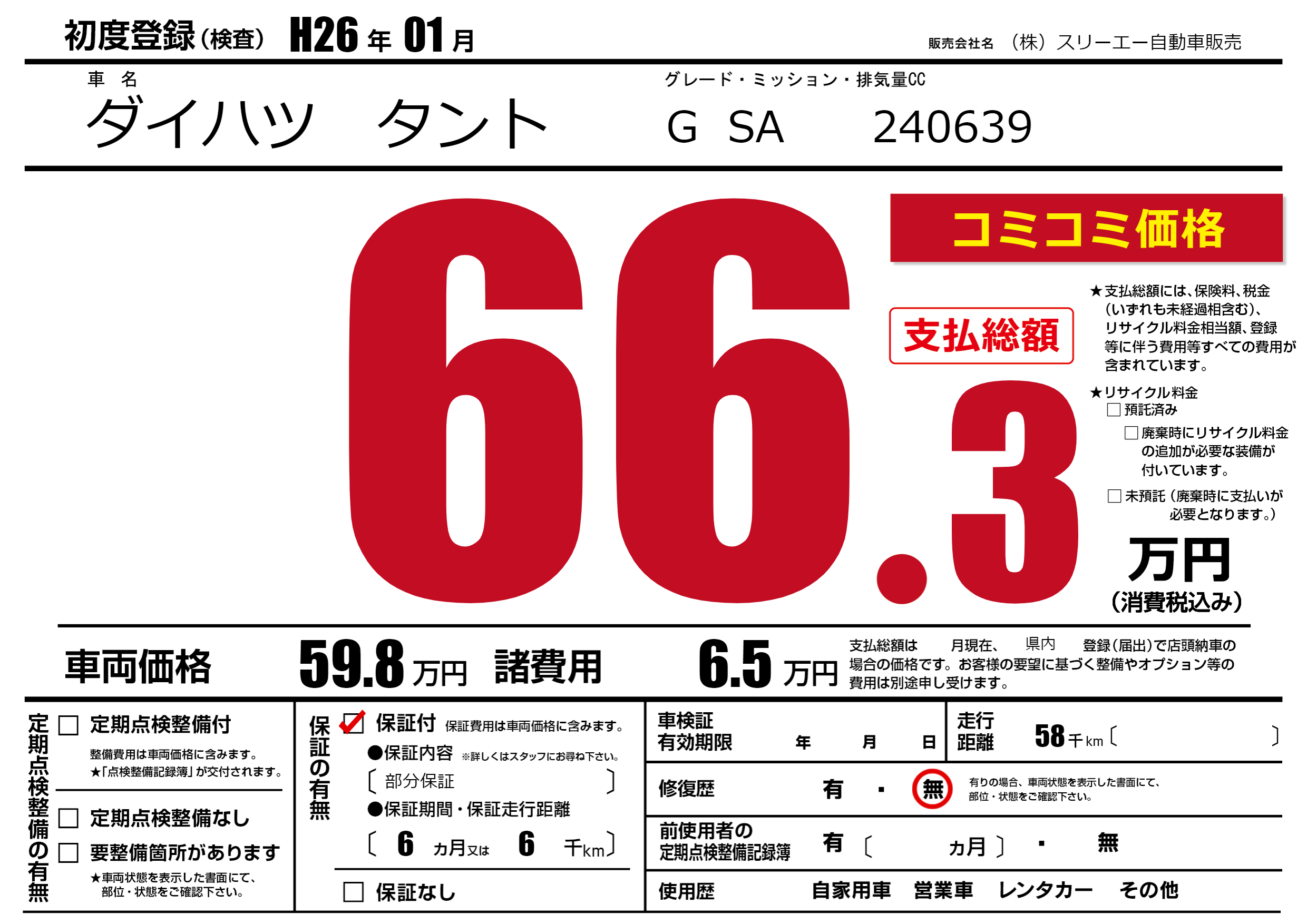 | 車名 | ダイハツ タント | グレード ミッション 排気量 |