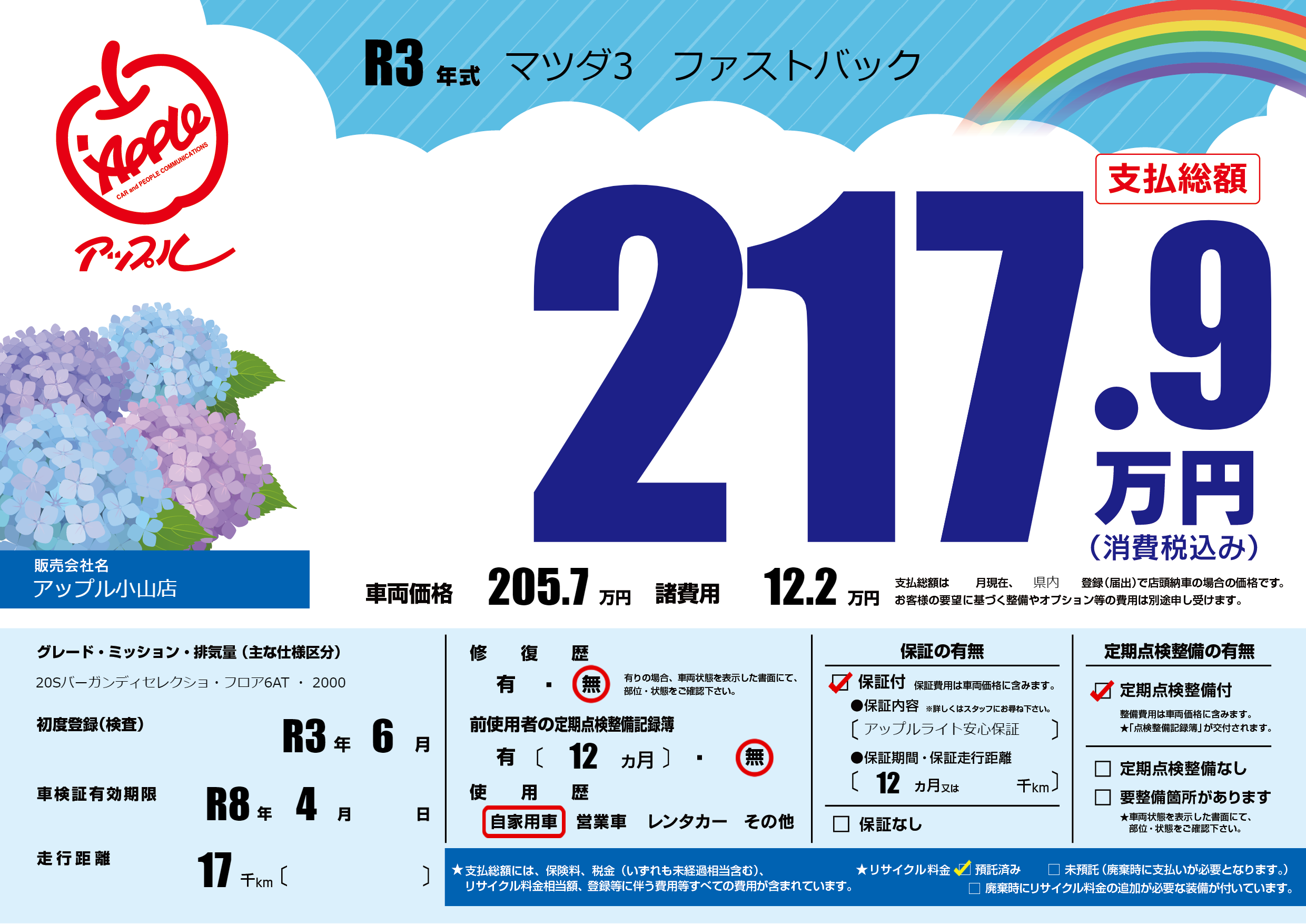 保証付き 保証内容(アップルライト安心保証) 12ヶ月または()千kmまで |