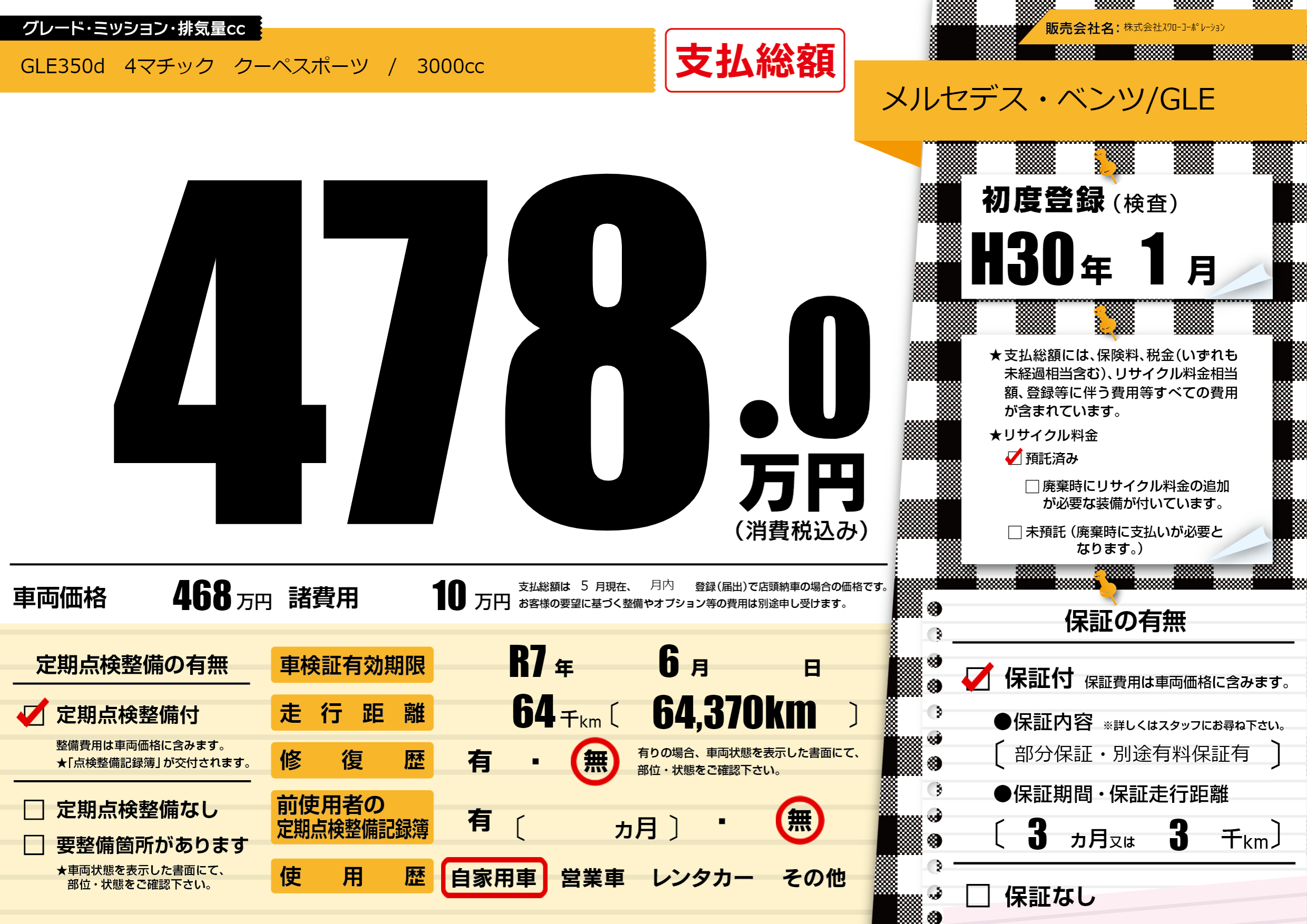 | 車名 | メルセデス・ベンツ/GLE | グレード ミッション 排気量 |