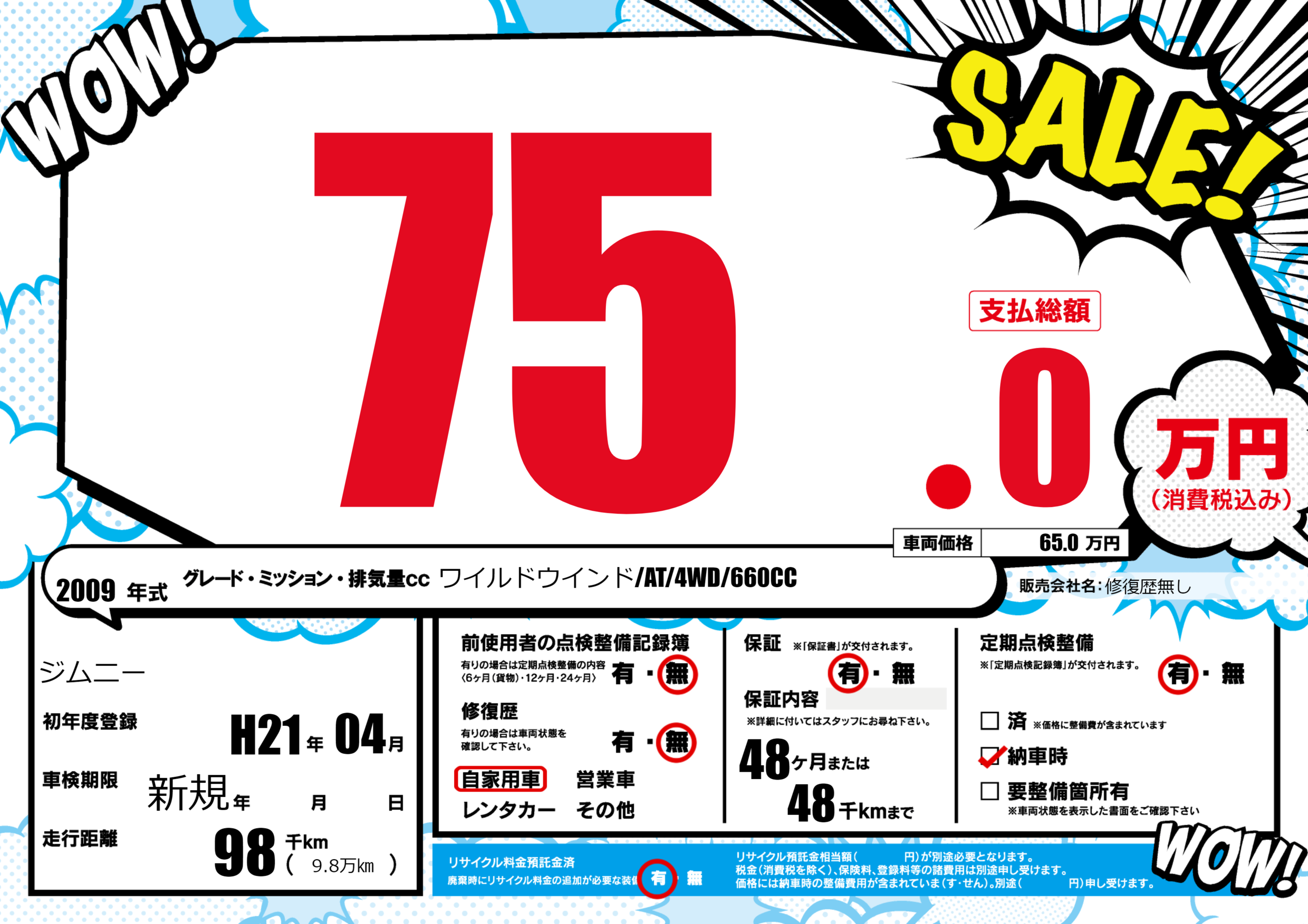 | 走行キロ | 9.8万km | 初年度登録 | H21年04月 |