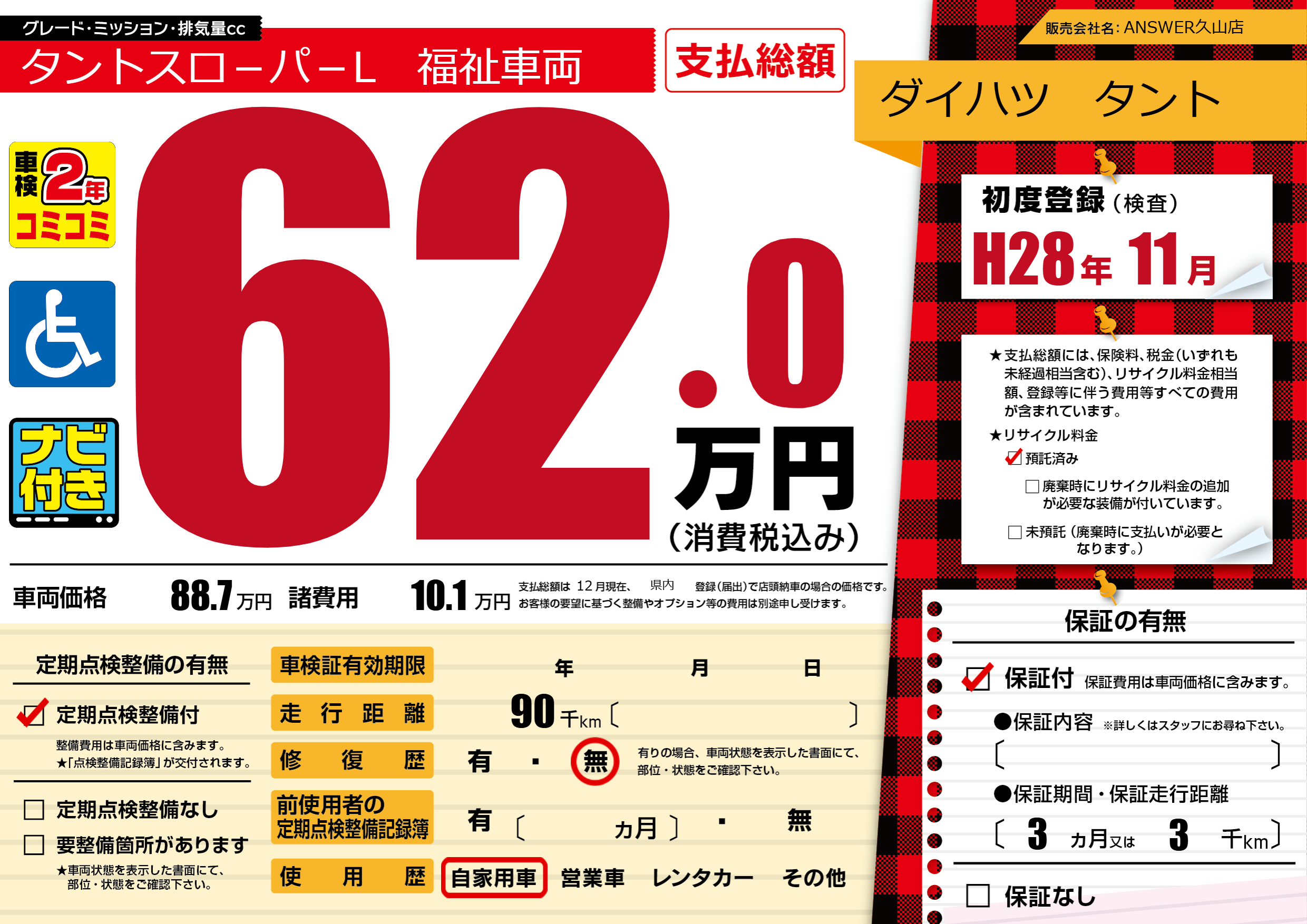 保証付き 保証内容(---) 3ヶ月または(3)千kmまで |