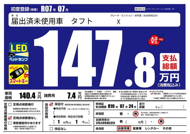 | 車名 | 届出済未使用車 タフト | グレード ミッション 排気量 |