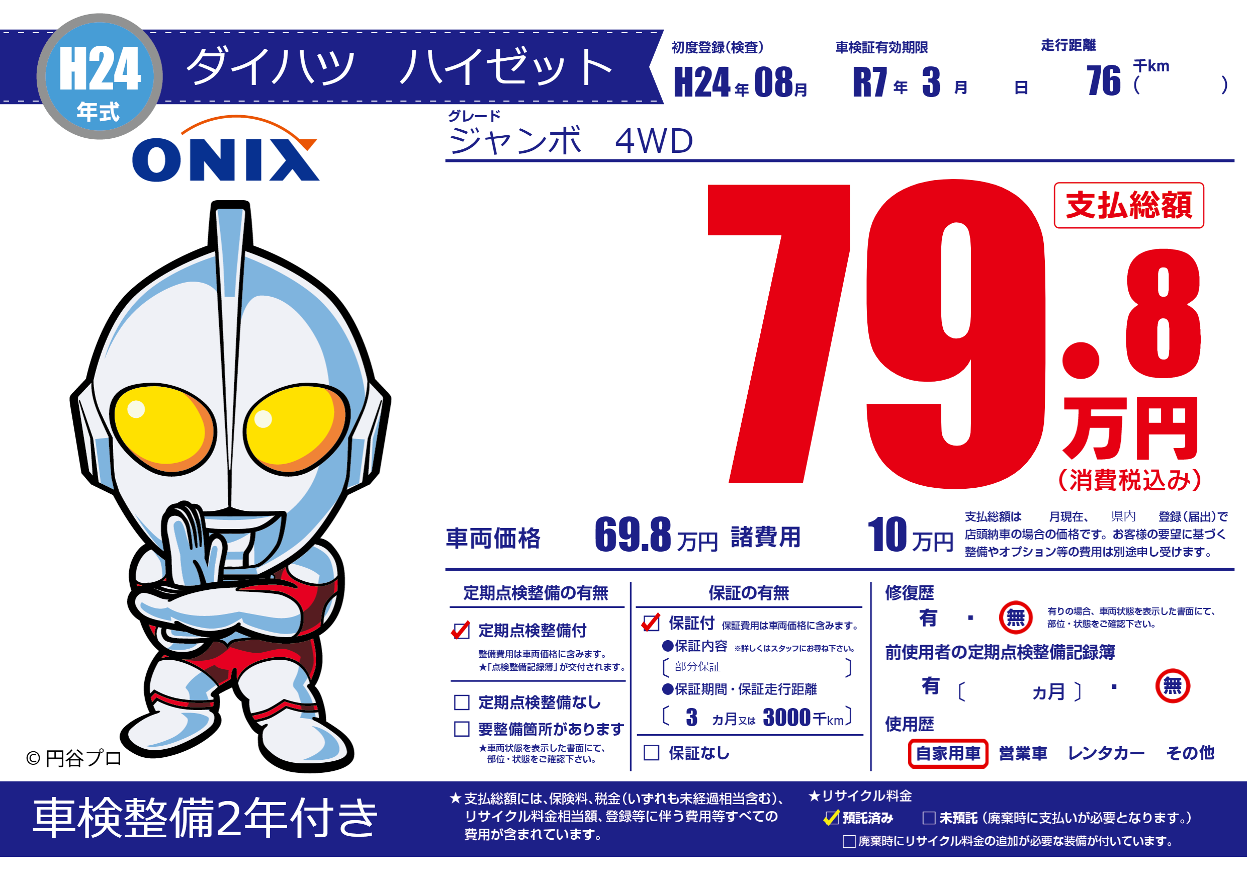 | 走行キロ | 7.6万km | 初年度登録 | H24年08月 |