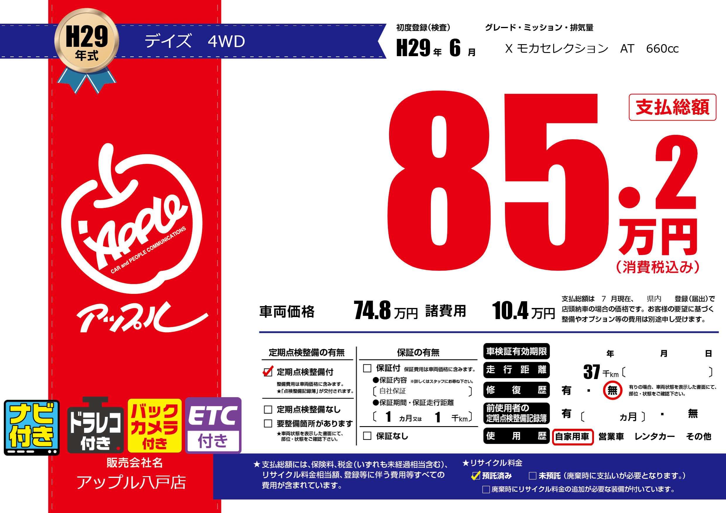| 車名 | デイズ 4WD | グレード ミッション 排気量 |