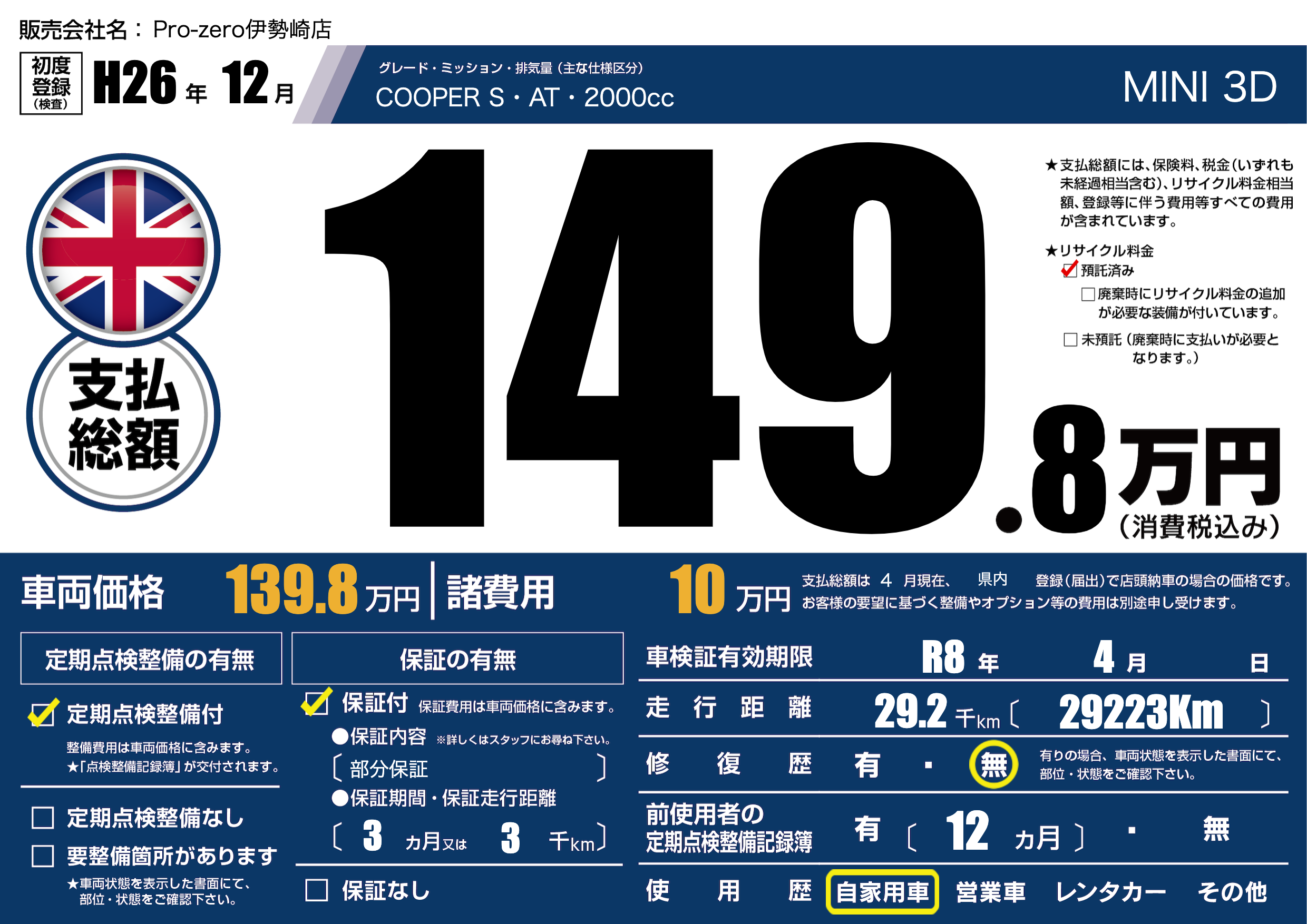 | 車検制限 | R8年 4月 - 日 | ||