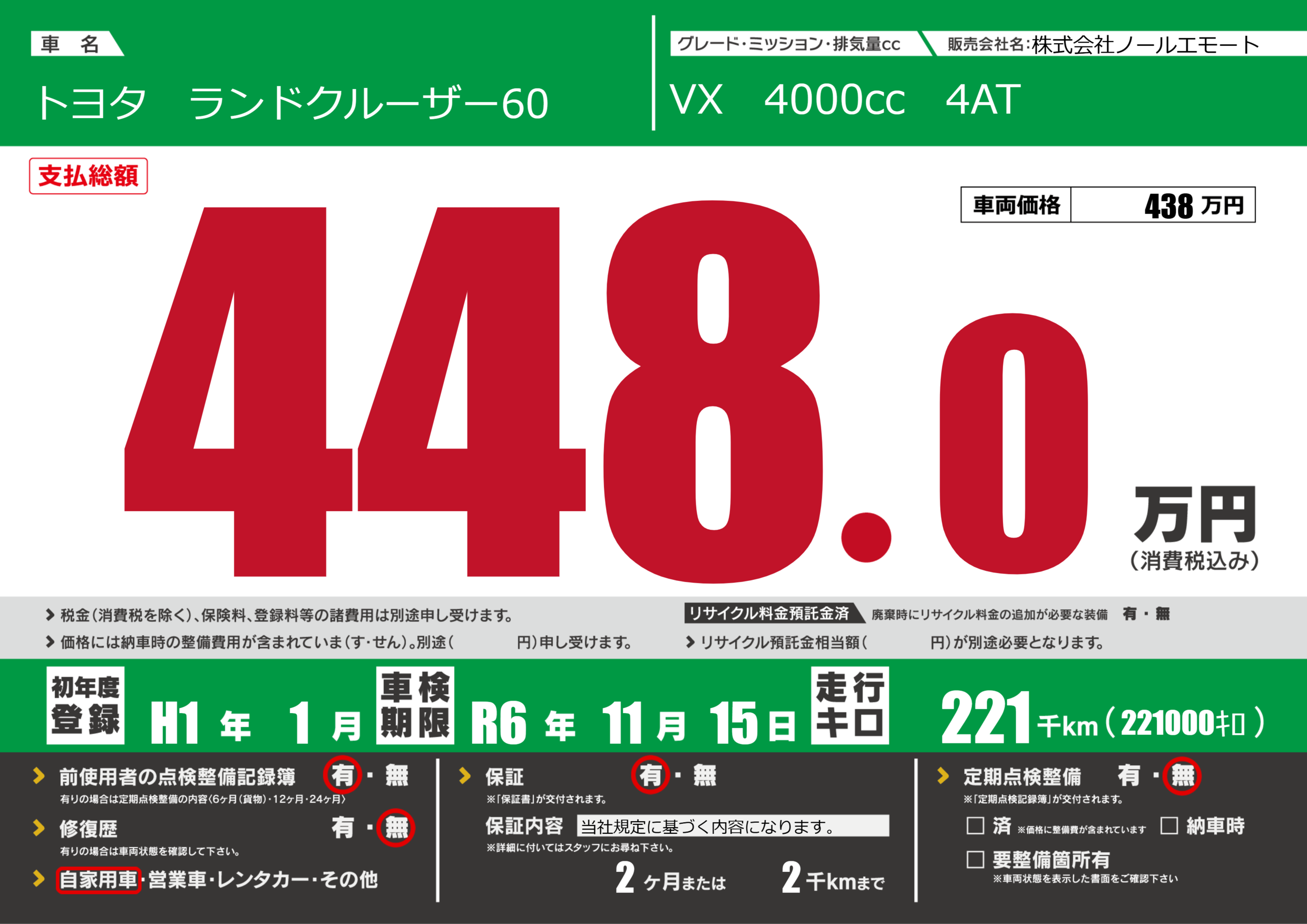 保証付き 保証内容(当社規定に基づく内容になります。) 2ヶ月または(2)千kmまで |