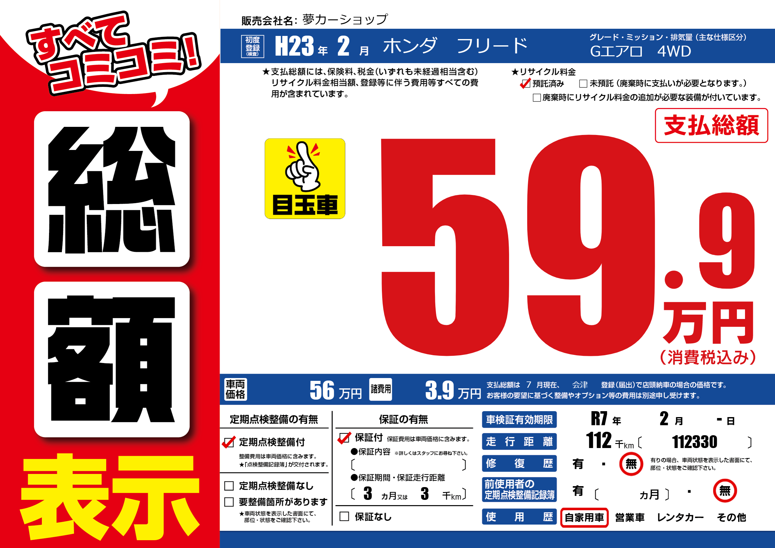 | 車名 | ホンダ フリード | グレード ミッション 排気量 |