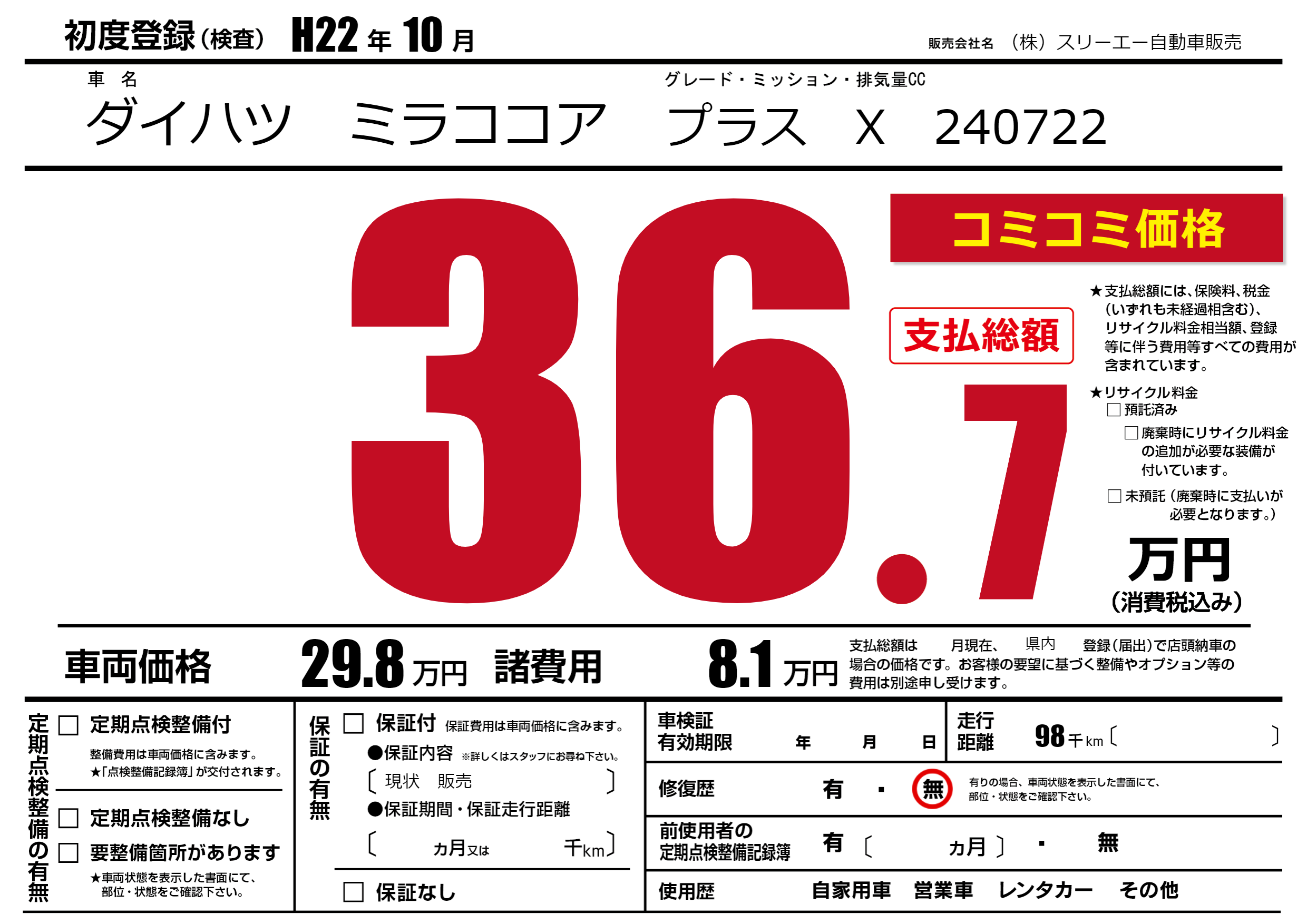 | 走行キロ | 9.8万km | 初年度登録 | H22年10月 |