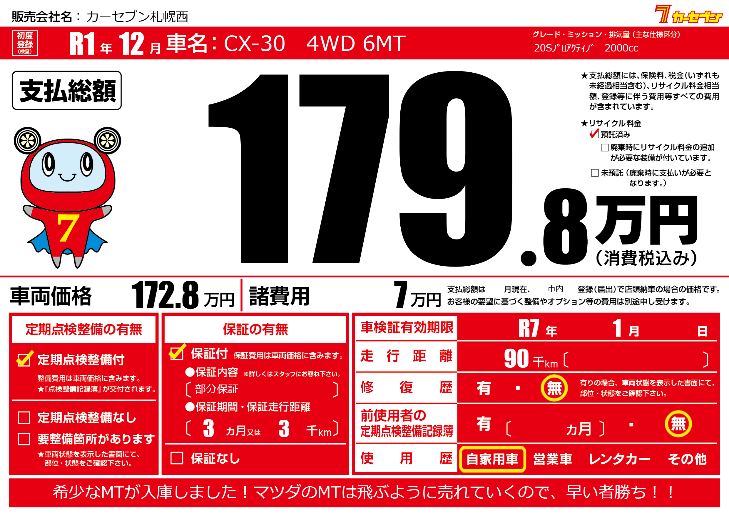 | 車検制限 | R7年 1月 - 日 | ||