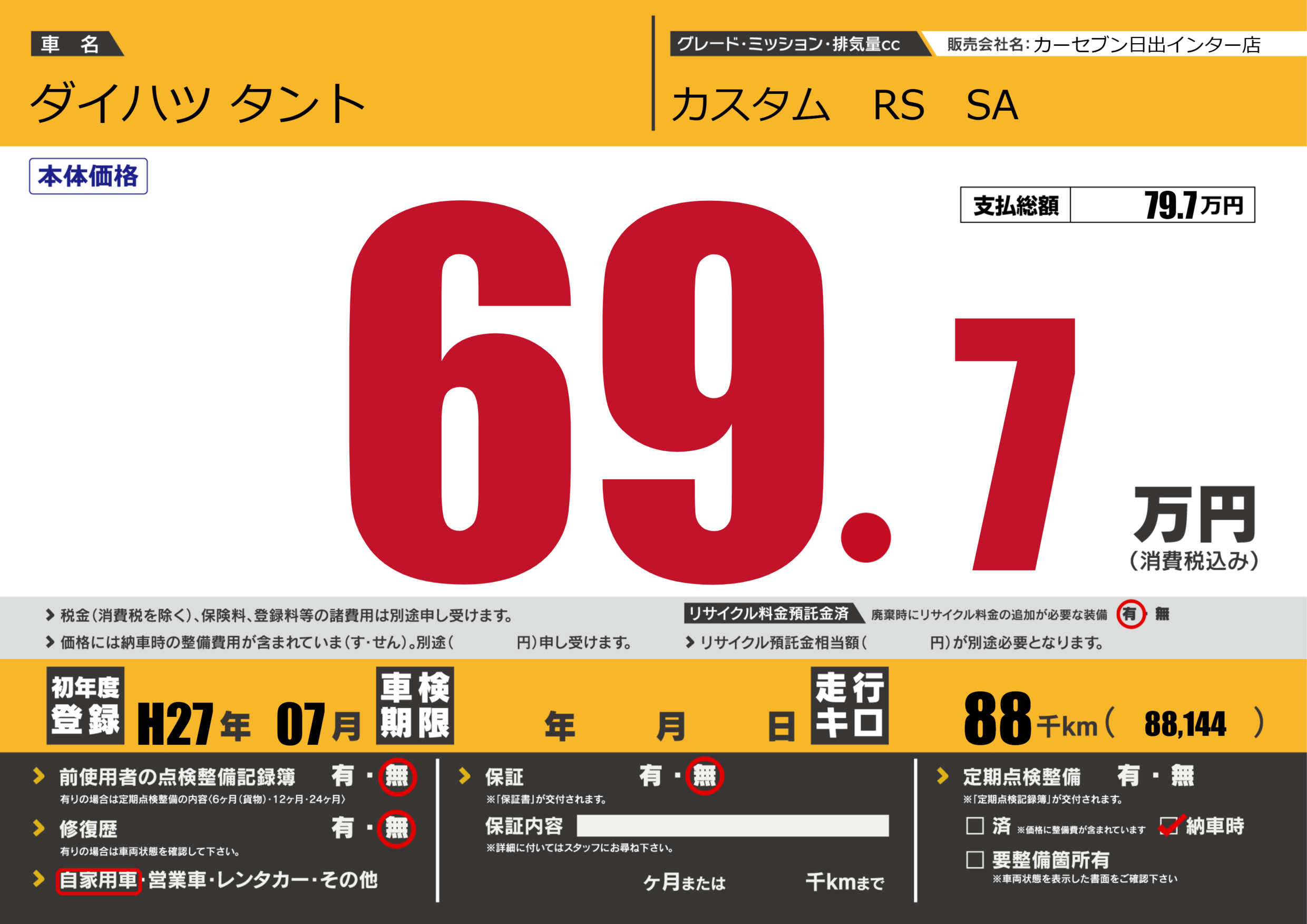| 走行キロ | 8.8万km | 初年度登録 | H27年07月 |