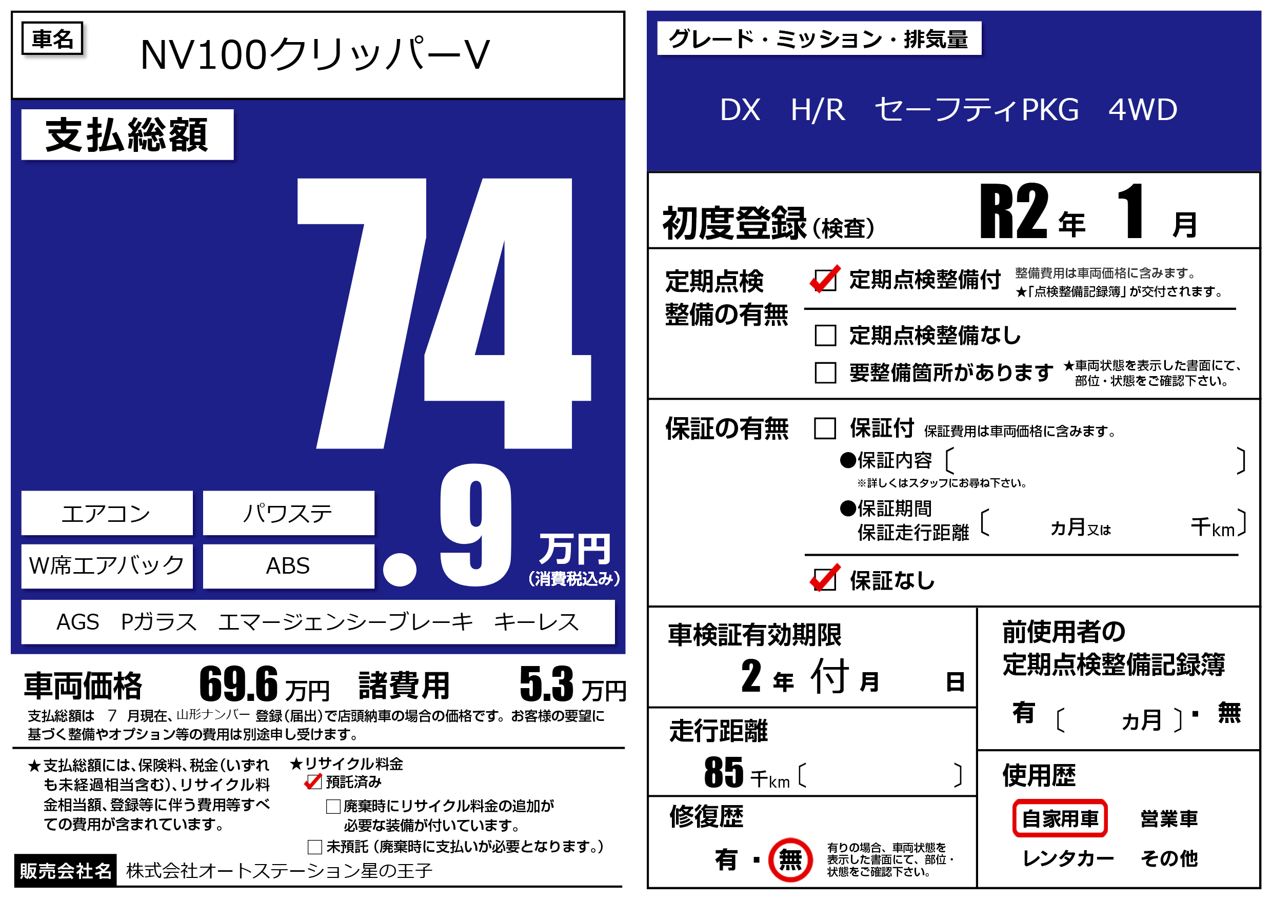 | 車名 | NV100クリッパーV | グレード ミッション 排気量 |